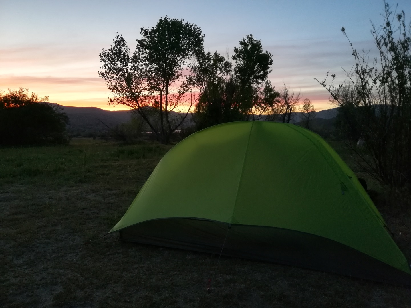 Vers 17h00 je tombe sur le spot parfait pour mon bivouac : au bord d’un petit ruisseau à sec et sous un arbre avec une vue magnifique et un grand soleil qui sera magnifique au coucher. Il y a 2 autres randonneuse déjà installées avec qui je discute un peu, puis dodo.