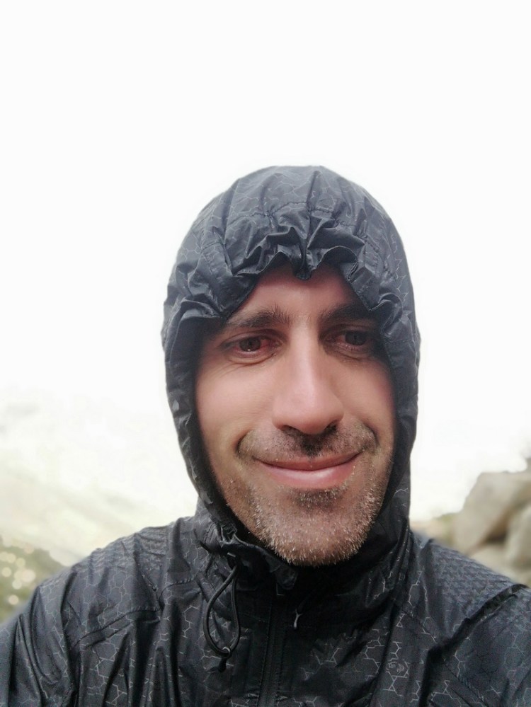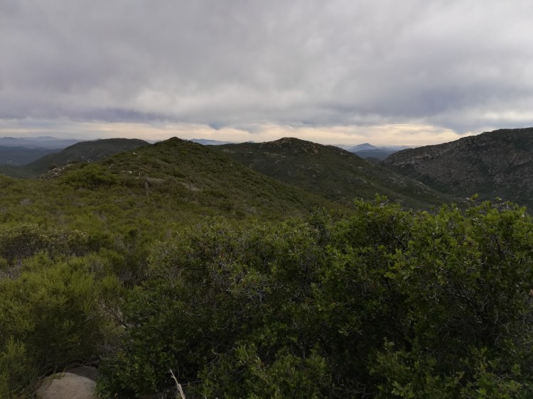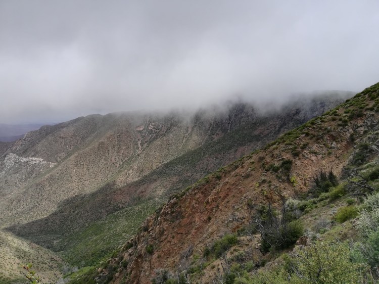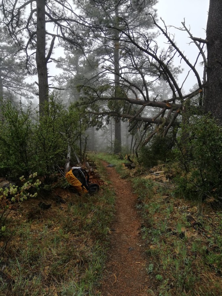 Je termine les 3 derniers miles de montée puis je vais cheminer dans des sous-bois très jolis au dessus de Mont Laguna. C’est toujours très couvert et je sens je vent qui forci à la cime des pins. Ça remonte ensuite un peu pour arriver sur un haut plateau et là c’est l’horreur. Le vent forci d’un coup avec des énormes rafales à plus de 80 km/h. J’ai du mal à tenir debout. Quand le vent est derrière moi je suis obligé de courir. Quand il est de côté je titube comme un ivrogne et quand il est de face je suis obligé de me mettre en position de chute libre (la tête penchée en avant et les bras derrière le corps). Au bout de 10 minutes de lutte, la pluie arrive et vient se fracasser contre mon visage à pleine vitesse. Il fait un froid glacial, température ressentie proche de 3 ou 4 degrés. C’est assez flippant d’autant plus que je suis seul sur le plateau et je sais que ça va durer plusieurs heures d’après le topo. Je n’ai pas le choix, il faut marcher sans s’arrêter car il fait trop froid. Dès que j’essaie de m’arrêter je me mets à trembler de tout mon corps. Je vais donc continuer ainsi pendant 4 heures non-stop. Vers 13h00 un minuscule bout de soleil déchire les nuages et je m’aperçois que je suis tout en haut d’un magnifique Canyon, au bord d’une falaise avec une vue à couper le souffle. Le chemin va maintenant serpente le long de cette falaise et alterner les coteaux exposés au vent du nord-ouest et ceux protégés, ce qui me permet de petites pauses pour manger une barre énergétique et boire.