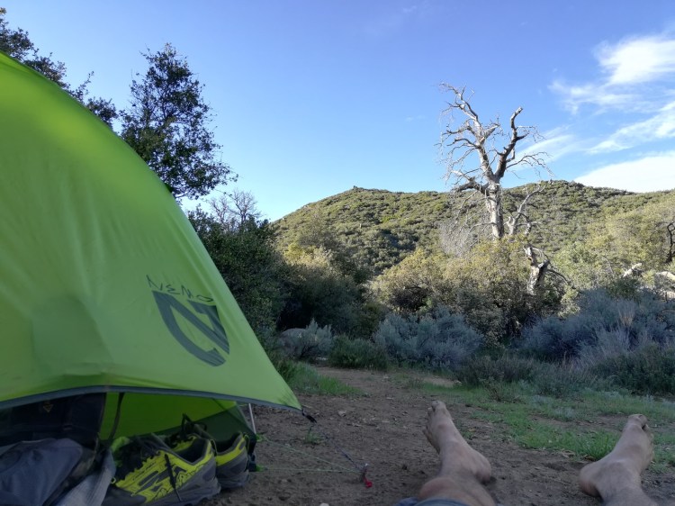 Je discute un moment avec un des trail Angels qui est un vieux randonneur américain. Je lui parle de mon sac qui me semble bien trop lourd et de mes épaules qui sont douloureuse. Ensembles nous déballons mon sac et trions ce qui n’est pas nécessaire et que je vais laisser ici dans une hiker box. Il s’agit d’une boîte dans laquelle on peut déposer ou prendre des affaires. J’en trouverai tout au long du PCT. Enfin je franchis des derniers mètres qui me séparent du site de camping réservé aux randonneurs et je monte ma tente. Nous sommes au bord d’un lac et c’est assez marécageux mais la vue est belle. Il y a des douches payantes mais je décide de ne pas en prendre : c’est mon petit geste de rébellion et j’ai déjà eu bien assez de luxe comme ça