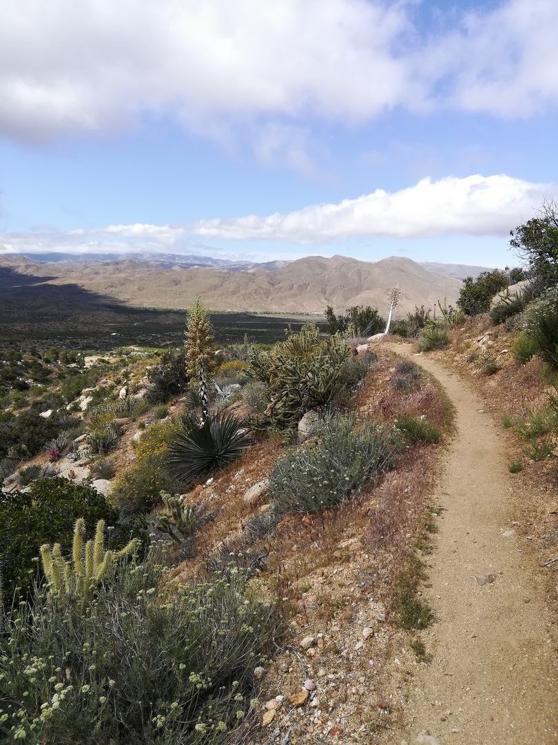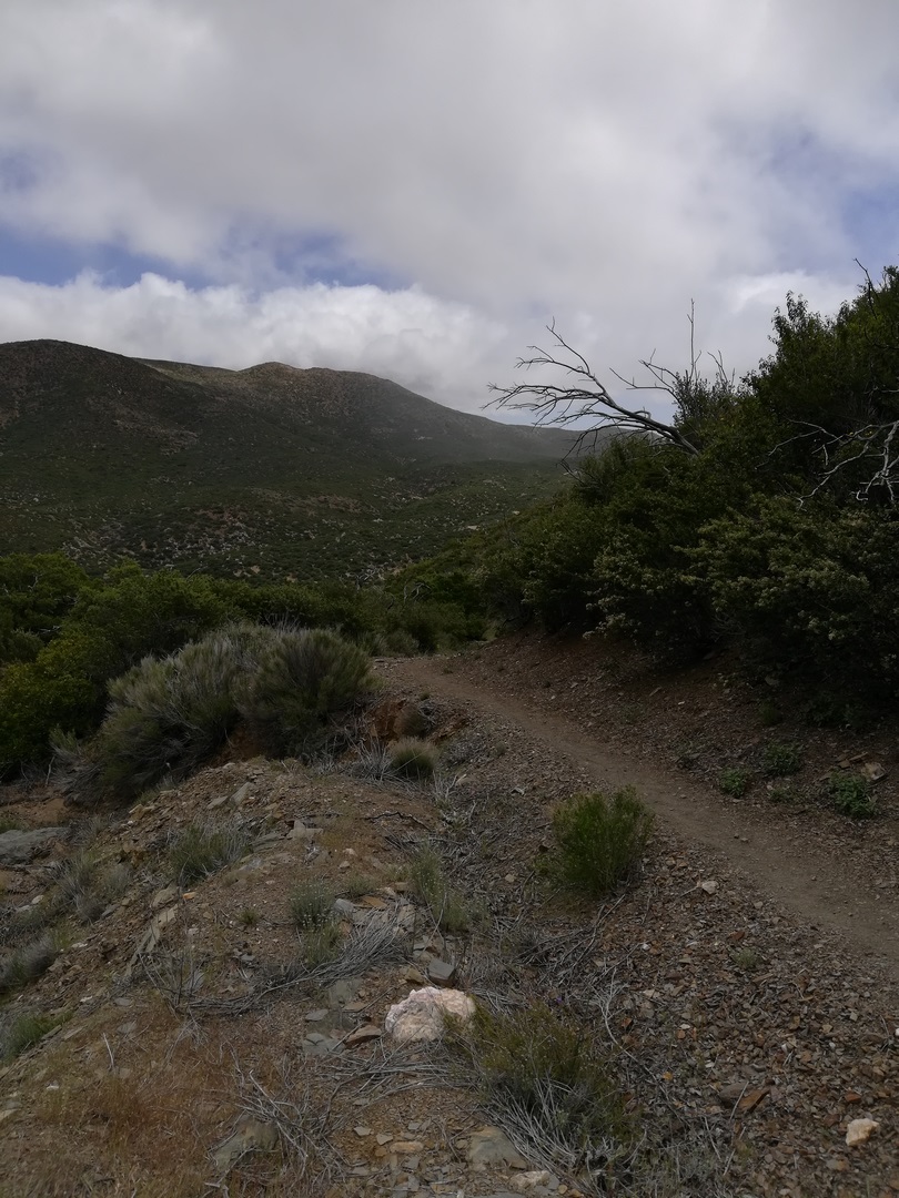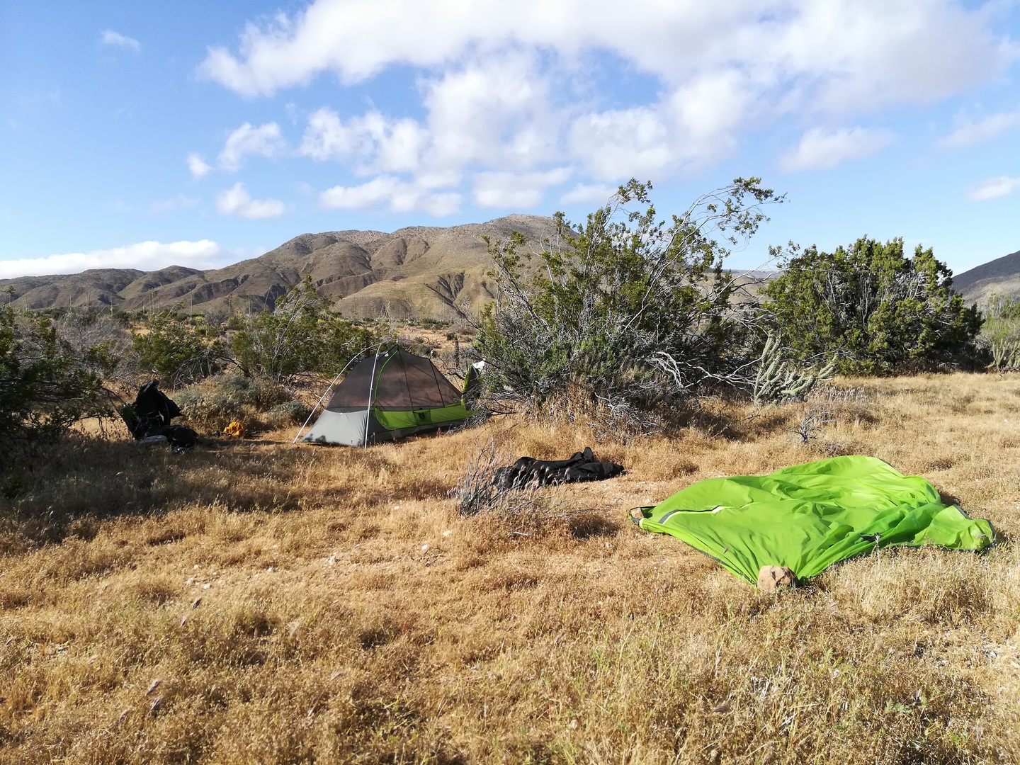 La nuit à été dure et je me réveille sous une bruine assez épaisse. Tout est mouillé et bien sûr mes vêtements de marche n’ont pas séchés. Je plie donc ma tente toute mouillée et remets mes vêtements humides… C’est dur, mais il ne faut pas traîner si je ne veux pas avoir froid. Je me mets donc en marche rapidement et mange une barre énergétique en route. Je fais un petit détour du PCT de 0,5 miles pour aller chercher de l’eau à un parking qui croise une route. Il y a moins de vent et les nuages s’élèvent un peu. Il y a même des toilettes avec du papier WC dedans ! J’en profite pour y faire un détour. 1 heure plus tard, la magie opère, je vois le chemin qui descend de manière vertigineuse au fond d’un Canyon et le ciel se déchire d’un coup. Le soleil brille à nouveau et c’est un tel bonheur difficile à décrire après ces moments assez difficiles. Toute la fatigue disparaît pour laisser place à une espèce de bonheur intense. Je dévale avec joie et légèreté la montagne. Je me surprends même à courir par moment. Alors bien sûr, qui dit descente dit remontée, c’est comme çà que ça marche le PCT. Mais je me sens à nouveau d’attaque et je repars sur les flancs de montagne tantôt montants, tantôt descendants. Je finis par arriver dans une plaine, redescendu à 1000 mètres d’altitude avec toujours du vent mais bien moins fort, et surtout un grand soleil. Je décide de bivouaquer ici au Mile 75,6. Je sors mes affaires trempées qui vont sécher en 5 minutes. Un vrai bonheur. Première nuit tout seul entouré de montagnes. Demain matin, je fais du stop sur la route située 2 miles plus bas pour me rendre à Julian pour un jour off bien mérité. Au programme, une chambre d’hôtel avec douche chaude, lessive et bonne bouffe (spécialités de tartes aux pommes). Le moral est à nouveau excellent.
