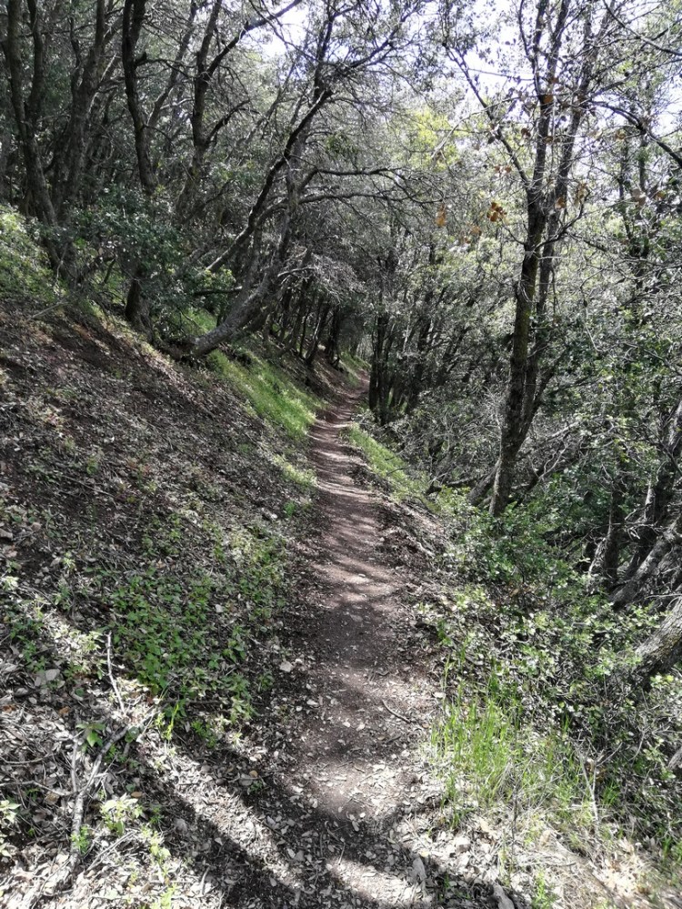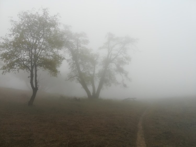 Le départ se fait comme c’est d’usage par une bonne montée et se poursuit sur les sommets pendant un bon moment, traversant des forêts de chênes. Malheureusement le mauvais temps annoncé pour demain arrive dès 15h00 avec le scénario habituel : le vent se lève rapidement et se met à souffler en rafales glaciales puis le ciel se noirci progressivement. Je reçois même une alerte météo sur mon téléphone : « attention, phénomène météo en cours, vous êtes en zone inondable ». Tient, on l’avait pas encore eue celle-là ! Je passe rapidement le mile 500 pour la forme et me trouve un abris pour planter ma tente. Encore un repas préparé sous le minuscule auvent du fait de la pluie et je suis sous le duvet à 18h30 à écouter la pluie tomber sur moi.