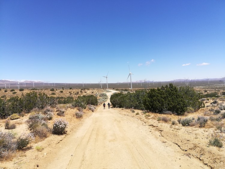 L’après-midi se fera avec la descente de cette même montagne puis la traversée de nouveaux champs d’éoliennes (encore plus nombreuses que la veille). Je comptais bivouaquer 7 ou 8 miles avant la ville de Tehachapi mais le chemin serpente dans les éoliennes. C’est très bruyant et il n’y a aucun endroit pour planter sa tente. Je vais donc aller au bout des 26 miles et retrouver Fred qui était parti très tôt du campement ce matin. On fait même la course à la fin pour rejoindre la route. Il a trop d’avance et j’arrive juste derrière lui malgré mes efforts. On appelle un trail Angel qui vient nous chercher et va nous loger pour 2 nuits.