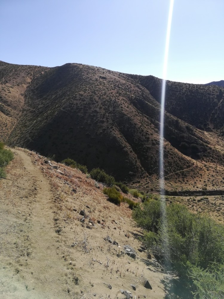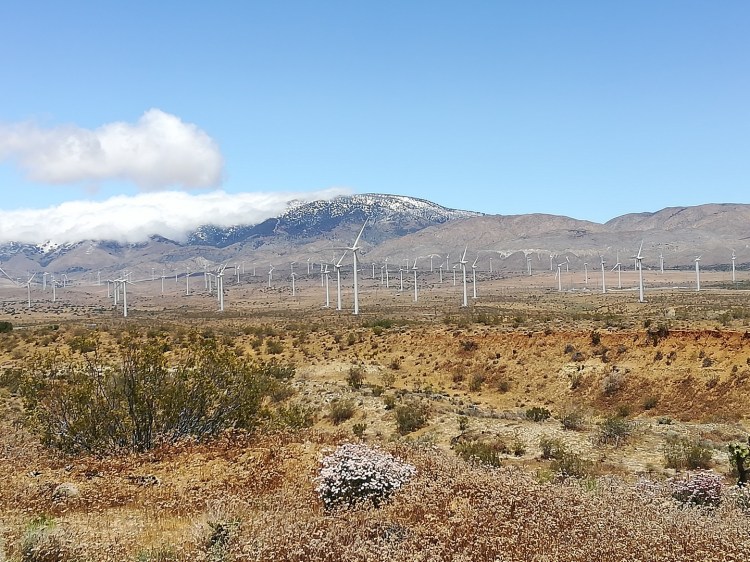 On commence par longer l’aqueduc qui approvisionne Los Angeles en amenant l’eau de la Sierra Nevada vers la côte. C’est tantôt un canal ouvert, tantôt un gros tuyau fermé, tantôt une canalisation en béton enterrée. On va le suivre pendant près de 15 miles sur d’infinies lignes droites et du plat. Il y a énormément d’éoliennes qui alimentent Los Angeles, plusieurs centaines sans doute. Heureusement sur cette section nous avons le vent dans le dos. Nous avançons donc rapidement et avons déjà franchis les 17 premiers miles à 13h00 pour notre pause déjeuner. Ce ne sera pas le cas l’après midi où le chemin revient dans un grand arc de cercle face au vent pour entamer la montée d’une montagne où se trouve le seul point d’eau du désert. Ça devient très sportif et marcher est parfois impossible dans les grosses rafales sur les crêtes. Je suis obligé de m’arrêter et me mettre de dos pour laisser passer les risées avant de reprendre mon chemin en louvoyant.