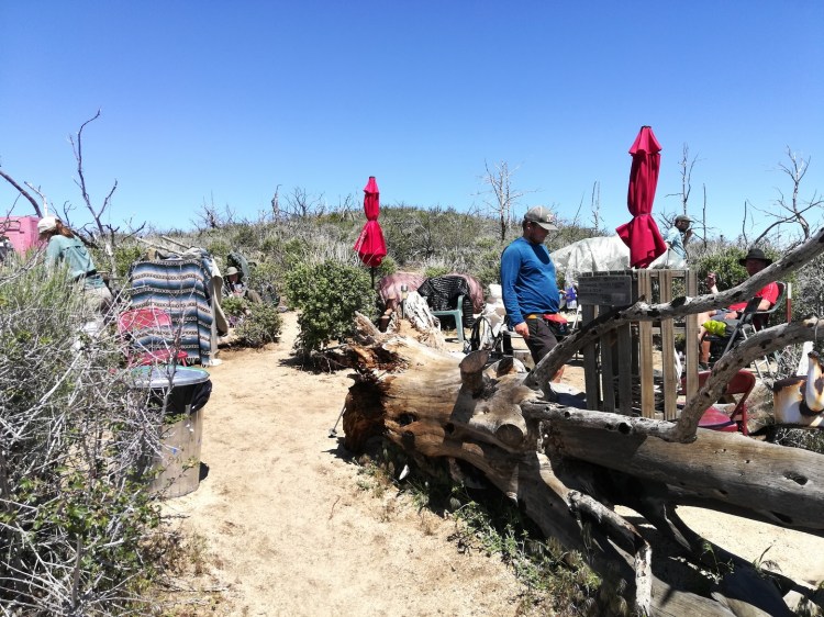Finalement j’ai passé une très bonne nuit. J’ai écouté de la musique pendant que le vent battait ma tente et me suis endormi. Je me suis réveillé vers 23h00 et le vent était complètement tombé. Au réveil tout est trempé alors qu’il n’a pas plu. Je décide de prendre mon temps aujourd’hui. La météo est annoncée bonne et le vent moins fort. Je prend donc un café et des céréales. Ça faisait longtemps que je n’avais pas pris de petit-déjeuner. Lorsque je pars il fait déjà bon et je peux rapidement quitter ma veste. C’est agréable de pouvoir remarcher sans se faire malmener par les éléments. Une grosse montée raide m’attend et je retrouve du plaisir à marcher. Je peux enfin revoir les paysages qui m’entourent. Au sommet, un trail Angel à installé un petit salon de plein air avec des chaises et des parasols au milieu de nulle part. C’est très étonnant et agréable. Je prend le temps de me poser avec d’autres randonneurs, de manger des tortillas et de l’ eau déposés à notre intention.