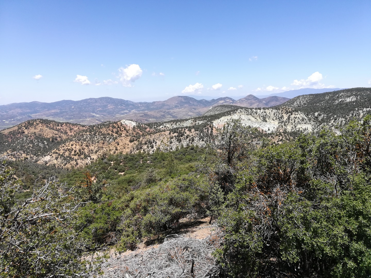 J’attaque donc directement par la montée de 5 miles qui est assez raide mais vraiment très belle et il fait bien frais en partant à 7h00. On retrouve rapidement de la végétation d’altitude avec des sapins. Le sommet est à 7000 pieds et on va y rester la majeure partie de la journée. Du sommet on voit le désert derrière nous et se profilent les contreforts de la Sierra Nevada. On voit les premiers sommets enneigés qui ne sont désormais qu’à 3 jours de marche !