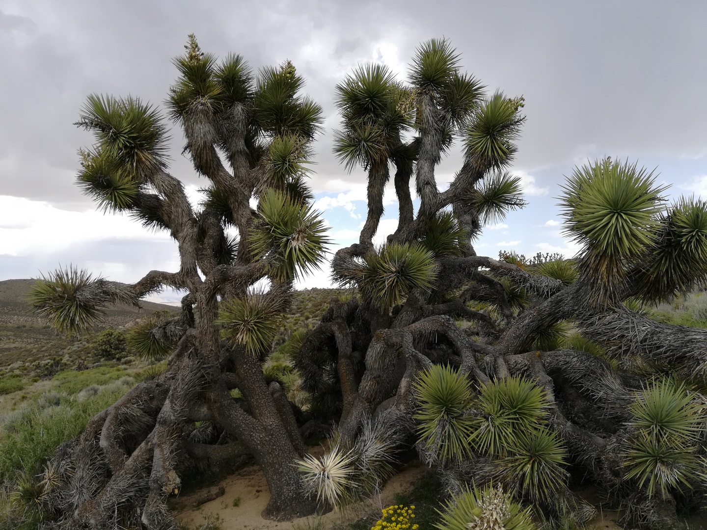 Je pars donc avec 5 litres d’eau et c’est lourd. Le début est très beau en sous-bois avec le soleil qui se lève. On voit plein d’écureuils qui courent sur le chemin et dans les arbres, les oiseaux chantent, la forêt se réveille tranquillement et je suis seul au monde. Je chemine comme çà et au moment où je me pose la question d’une petite pause à l’ombre, je passe un flanc de montagne et bim ! C’est le désert, d’un coup. Pas un coin d’ombre, pas un arbre, et la chaleur grimpe. J’arrive finalement à un croisement avec une piste et surprise, une water caché m’attend (des bonbonnes d’eau amenées par les Trail Angels). Je me pose un peu et boit 1 litre d’un coup. Ça rafraîchit et ça fait du bien. Il est 11h00 et le reste de la journée va se passer dans le désert. J’entame une bonne côte dans du gros sable lourd, c’est laborieux. Arrivé en haut, je repère un Joshua Tree qui va me fournir une petite ombre pour la moitié de mon corps et me permettre de manger pas trop exposé.