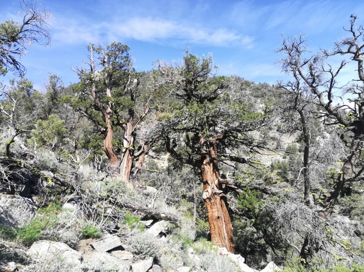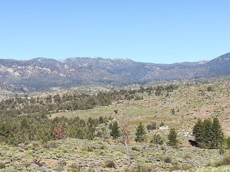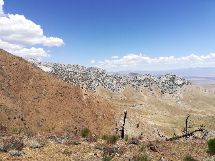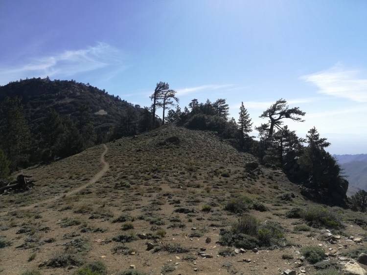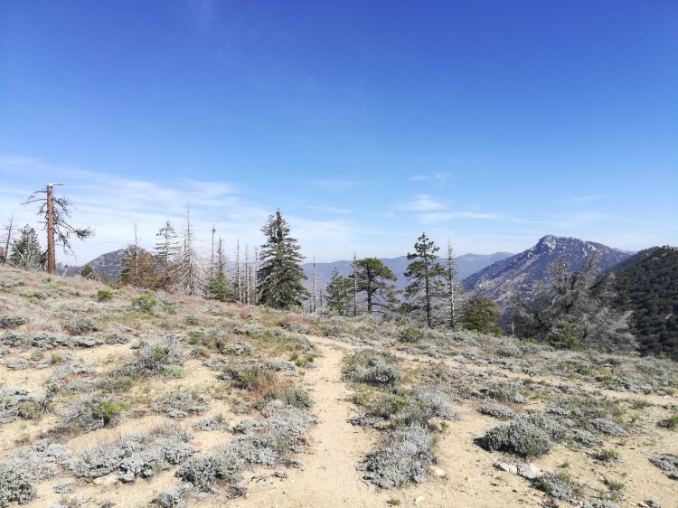 Vient ensuite la fin de l’ascension qui va être moins chaude heureusement. Cette deuxième partie se fait dans une forêt brûlée et donc pas mal de vent. Je redescends ensuite 5 miles et m’arrête pour camper sur un petit promontoire très joli. Fred me rejoint un peu plus tard.