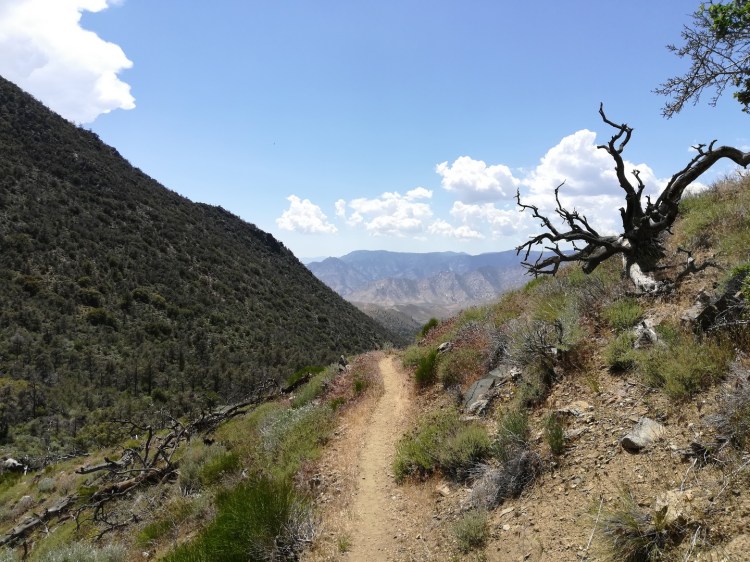Le départ est un peu compliqué, la ville étant loin du sentier. Un trail Angel devait nous amener mais ça tombe à l’eau. On prend donc un Uber et nous arrivons au départ vers 10h00. Il fait chaud et on attaque la première montagne de la journée qui nous mène sur un joli col un peu plus au frais mais on redescend immédiatement tout ce que l’on vient de monter avant de repartir pour une autre montagne qui nous fait redescendre tout aussi abruptement. On passe la marque du 1/4 du PCT. La journée se termine au pied de cette seconde montagne sous un tonnerre impressionnant qui n’accouchera heureusement que de quelques gouttes au moment où l’on plante la tente au seul point d’eau de la journée. Le temps se dégage ensuite rapidement et nous passons une soirée agréable et tiède jusqu à 20h00. Un record !