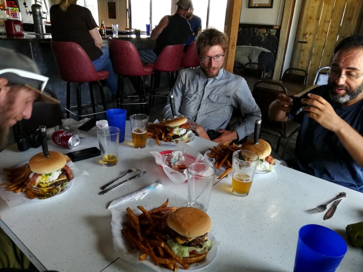 Rémi et Joris nous rejoignent peu de temps après et on se régale d’une magnifique bière victorieuse. On y est ! On se commande ensuite d’énormes hamburgers. Puis je vais chercher mes colis pour la Sierra.