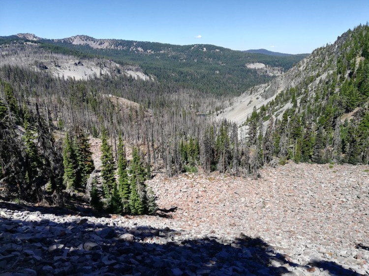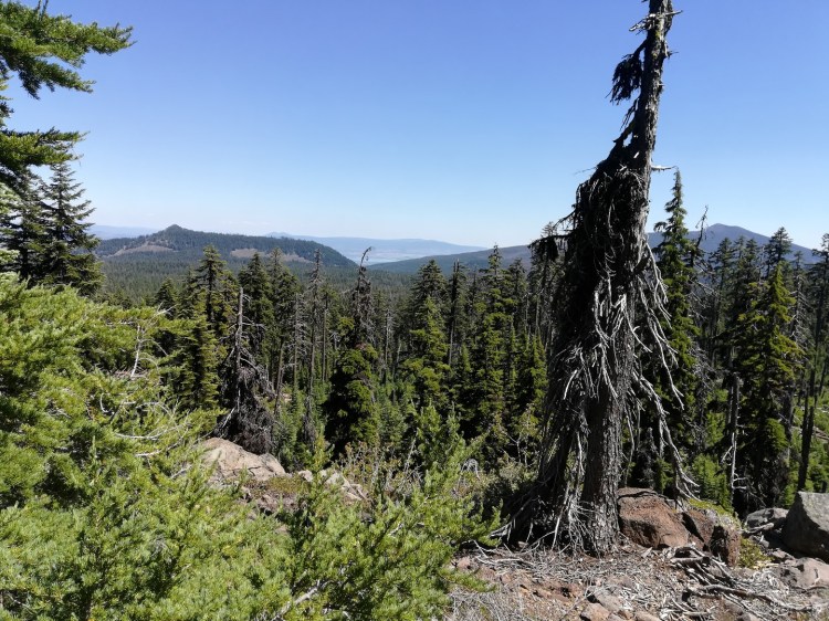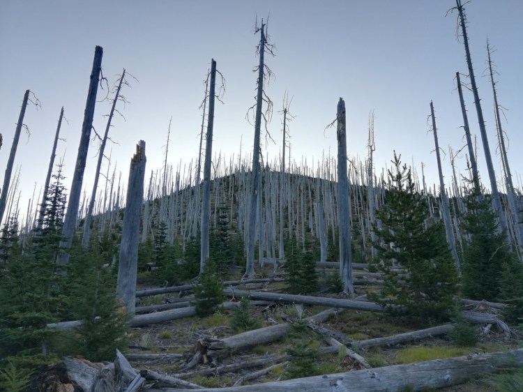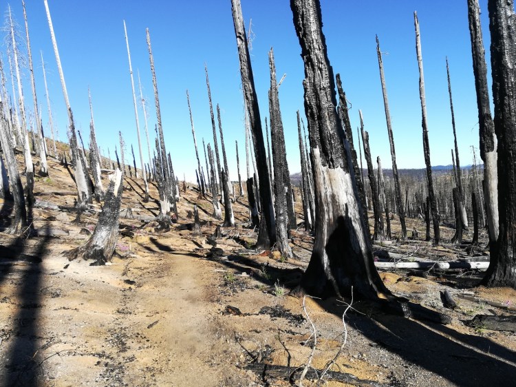 Aujourd’hui je redescends vers Mazama, le camps de base pour Crater Lake, un grand lac volcanique très connu ici avec une île au milieu. On va camper là bas et partir très tôt demain matin vers 4h00 pour arriver au lever du soleil. Le chemin est facile mais sans réel point de vue. On traverse pendant un long moment une forêt brûlée. Arrivée vers 15h00 au camp, douche, lessive et courses. Demain on doit faire 30 miles car ce sera le seul point d’eau sur le parcours.