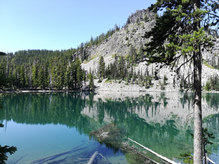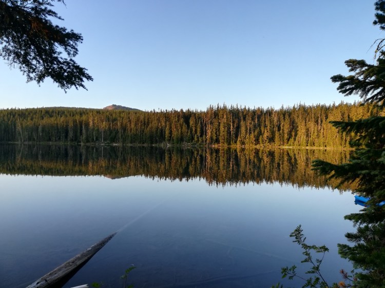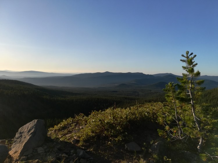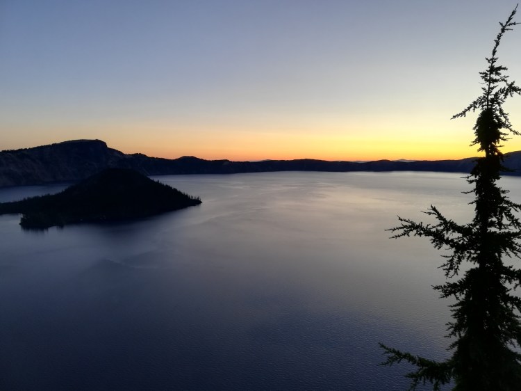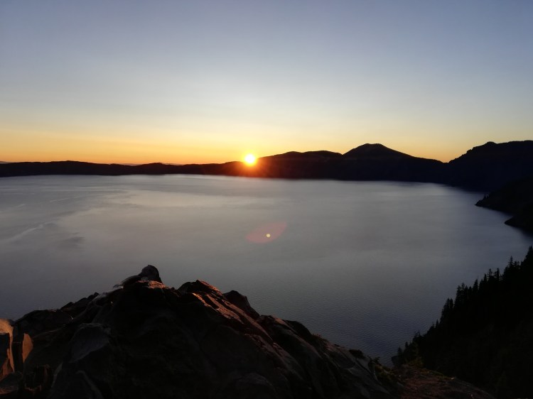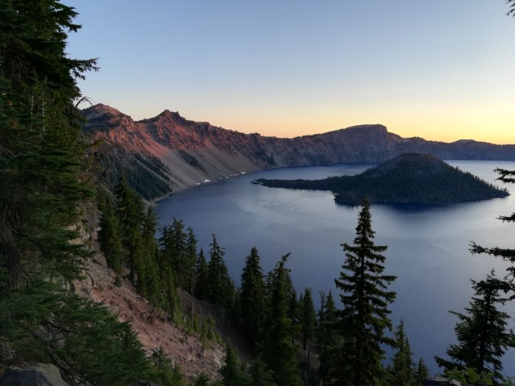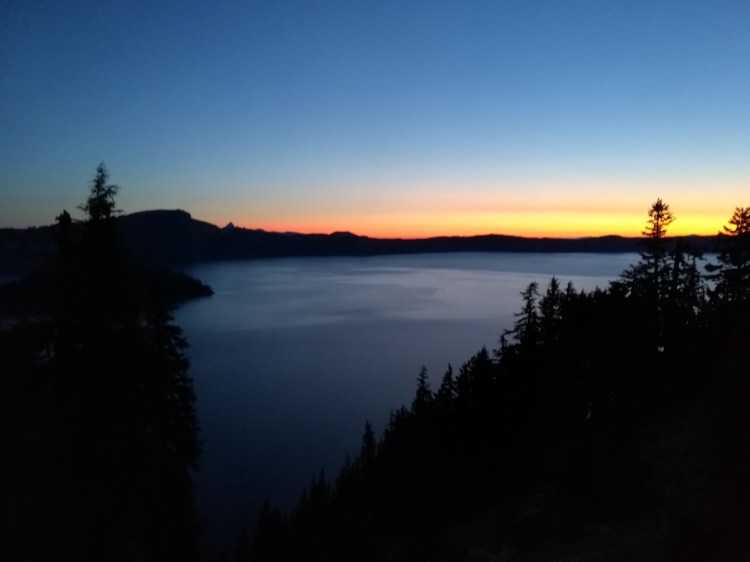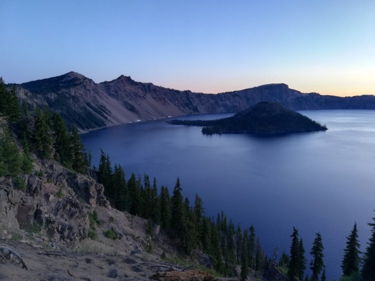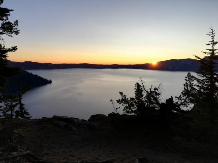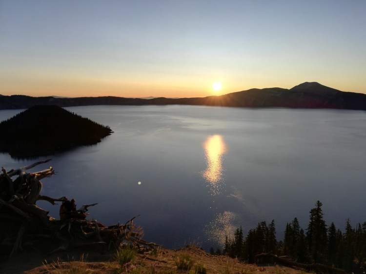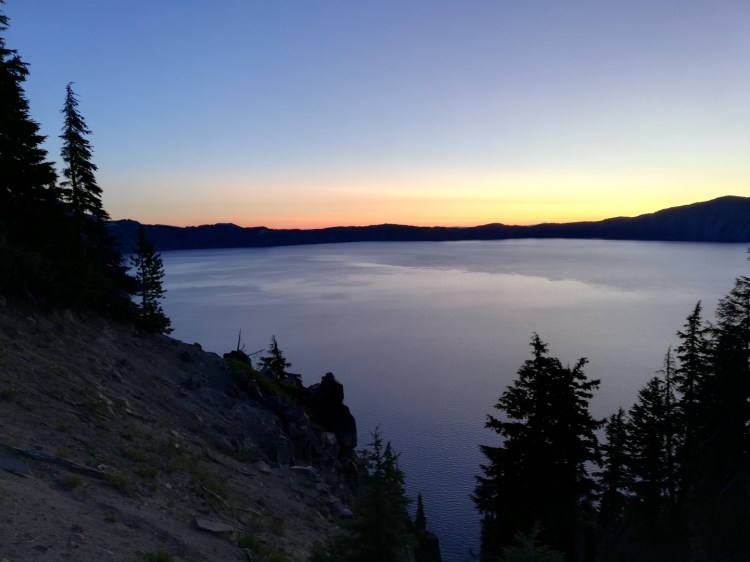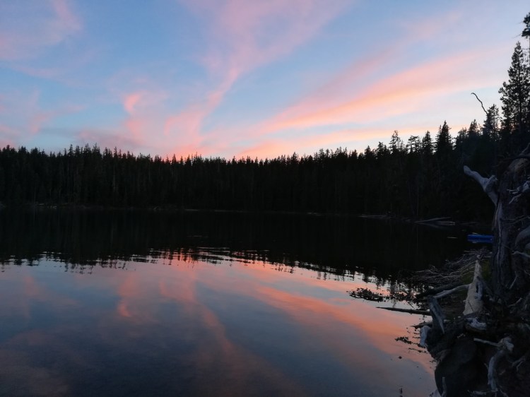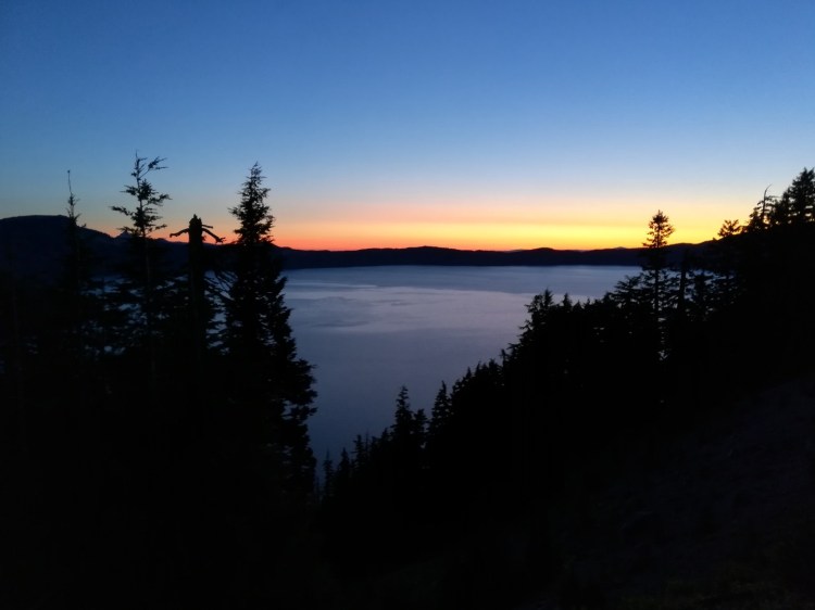 Départ à 4h00 du camp de Mazama avec 1h40 de montée bien raide à la frontale. On prend la déviation pour Crater Lake qui n’est pas sur le PCT. Arrivée sur le lac à 5h40, pile avec les premières lueurs du soleil, c’est magnifique. Le chemin suit les bords du cratère et c’est assez raide au début puis ça s’atténue. Pendant qu’on contourne le cratère on voit toutes les couleurs du soleil qui s’élève. Ensuite on rejoint le PCT 11 miles plus loin et il reste une bonne trotte. Tout d’abord une vaste forêt plane qu’il faut traverser et dans laquelle je prends mon repas et fais une bonne sieste car je n’ai pas beaucoup dormi cette nuit. Ensuite une ascension de 2 heures avec à nouveau de beaux points de vue sur la forêt et le mont Thielsen que l’on contourne. Arrivée au campement à côté de la rivière qui descend du glacier de Thielsen. Surprise, on retrouve Rémi qui a passé 3 jours avec sa famille et qui est là ce soir.