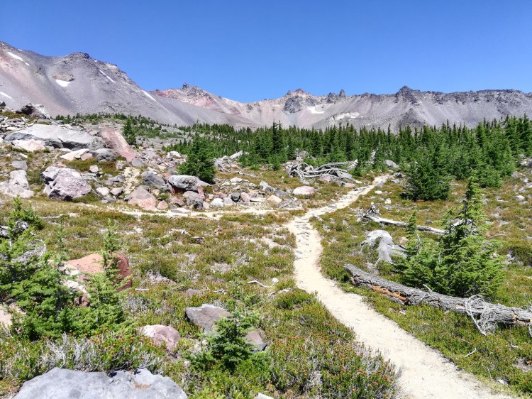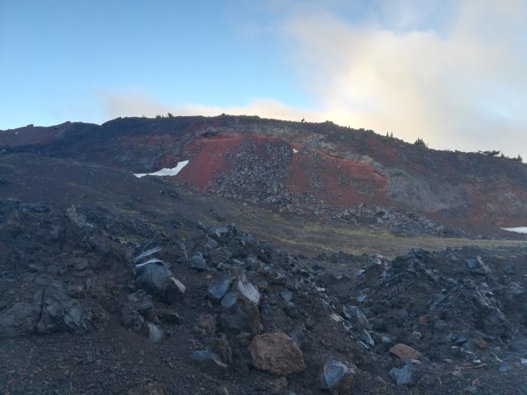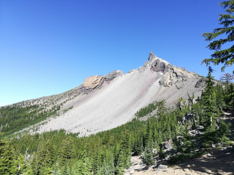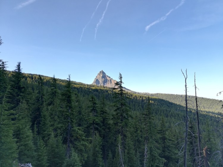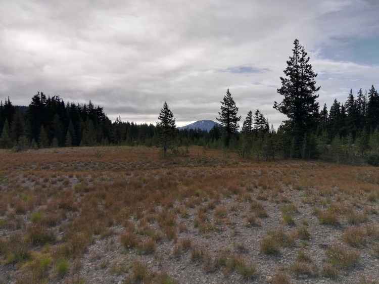 La pluie est annoncée pour cet après-midi et le ciel est déjà bien couvert. Je monte tranquillement la première côte puis redescends longuement dans les bois pour arriver aux pieds des three sisters, trois montagnes sœurs enneigées. C’est assez minéral avec une végétation sèche. Je mange tôt vers 11h00 vu la pluie qui se profile, et j’ai bien fait car il se met à pleuvoir vers 11h30. J’enfile m’a tenue de pluie et c’est parti pour 4 heures d’ascension mouillée. En route on croise une jolie cascade de 8 mètres et une zone couverte d’obsidiennes, des pierres volcaniques noires qui luisent drôlement sous la pluie. Pas de photos pour cause de pluie…