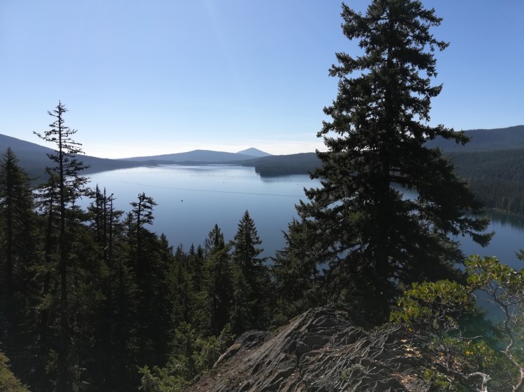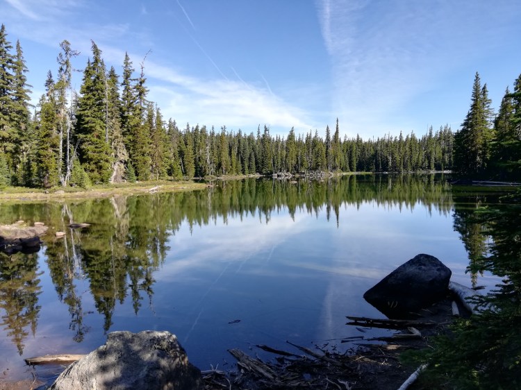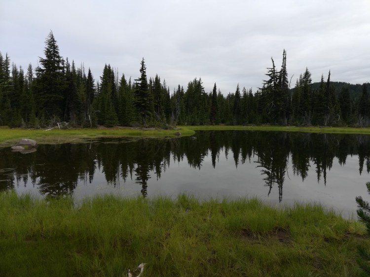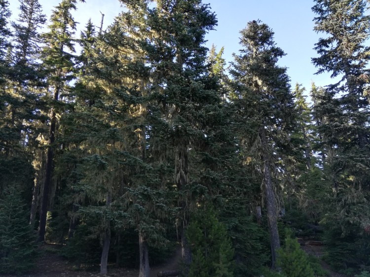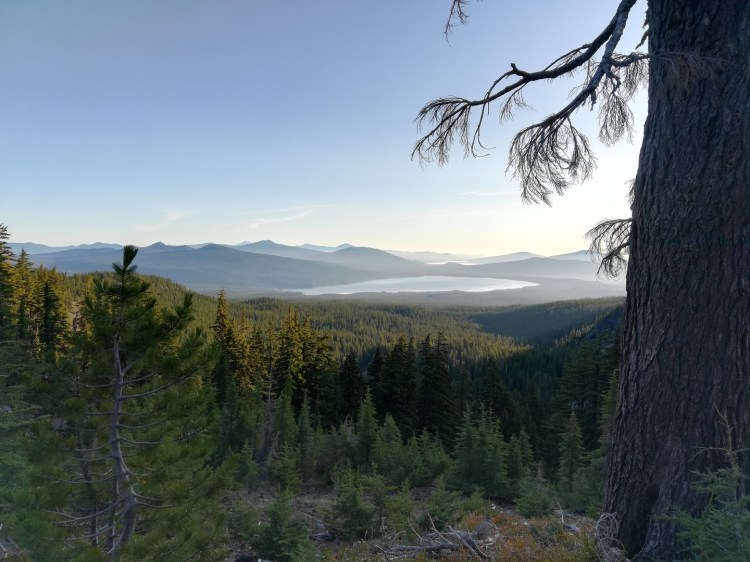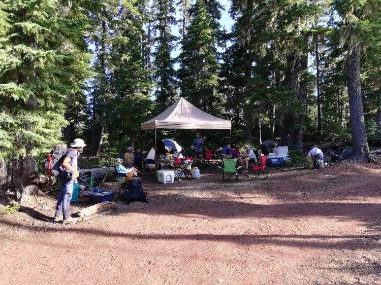 Lever un peu plus tard à partir de ce matin car maintenant il fait jour vers 6h00 et il fait à nouveau froid (3 degrés ce matin au lever). Je mets donc mon réveil à 5h30 désormais, d’autant plus que j’étais fatigué hier. J’ai donc passé une meilleure nuit et je pars en forme. Le chemin aujourd’hui est vallonné sans trop de grosses côtes, avec pas mal d’ombre, de belles forêts et de beaux points de vue. On commence par monter à 7500 pieds, le point le plus haut du PCT dans l’Oregon, puis on redescend tranquillement avec quelques lacs. Je rejoins Fred pour le repas et des randonneurs qui passent dans l’autre sens nous signalent un trail magic 4 miles plus bas. On finit de manger léger rapidement et on se remet en route pour arriver effectivement à notre premier Trail magic de l’Oregon. Et pour le coup il est vraiment génial : hamburgers au grill avec des vrais steak hachés frais et des légumes, boissons à volonté (sodas, bières glacés), oranges, pommes, brownies maison, cookie… C’est l’orgie dans la bonne humeur avec 7 ou 8 autres randonneurs et Joris et Rémi qui nous rejoignent. On reste là de 15h00 à 18h00 à papoter et profiter. Puis on repart pour trois quarts d’heure de marche avant de poser nos tentes.