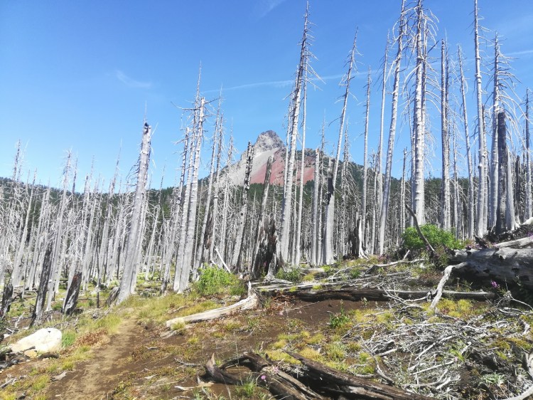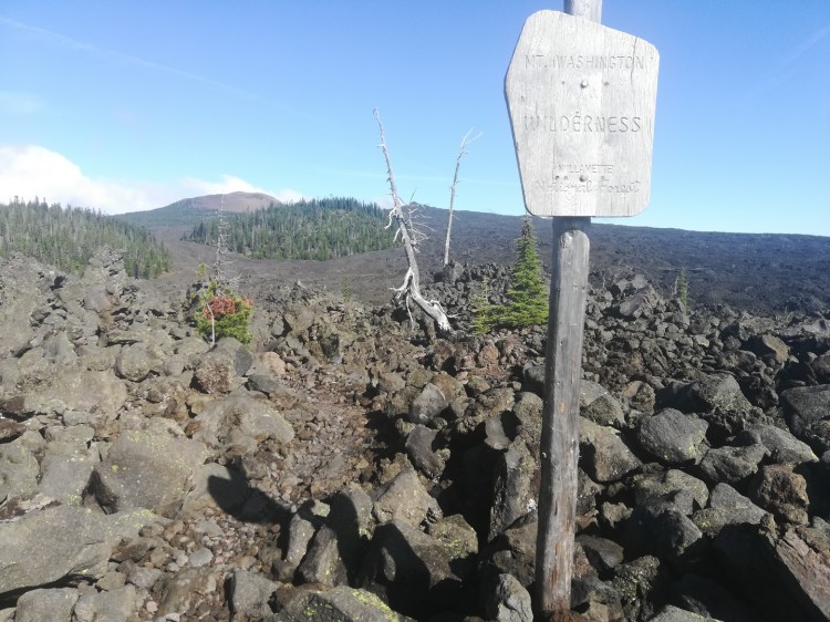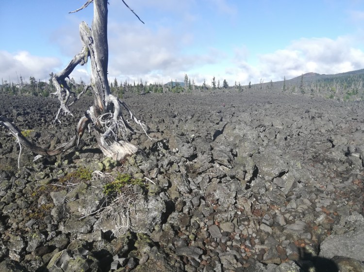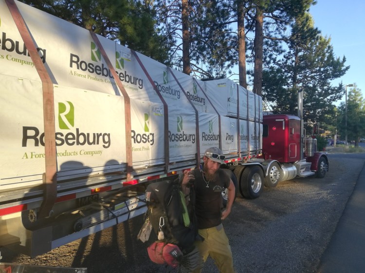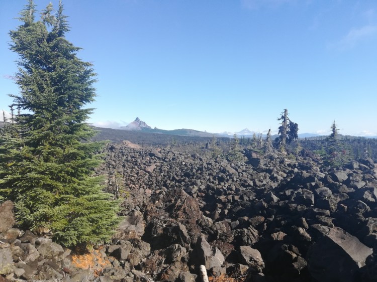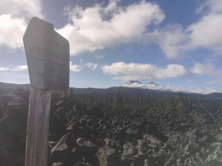 Il a plu toute la nuit et ça s’est calmé vers 04h00. Pliage de la tente toute mouillée et départ dans une jolie brume qui dévoile progressivement les sommets des 3 sœurs avec un arc-en-ciel. Ça descend ensuite progressivement pour aboutir dans un grand champs de lave. C’est très douloureux pour les pieds mais ça a une sacré gueule. On se croirait sur la lune. Vient ensuite une forêt brûlée puis une longue descente. Je franchis le mile 2000 en fin de journée avec un trail magic de bière bien fraîche. Il nous faut ensuite faire du stop pour rallier Sisters. Après un peu d’attente, on est pris par une camionneuse prénommée Summer qui nous embarque dans sa cabine et que l’on invite pour sa pause à boire un coup. Mémorable moment.