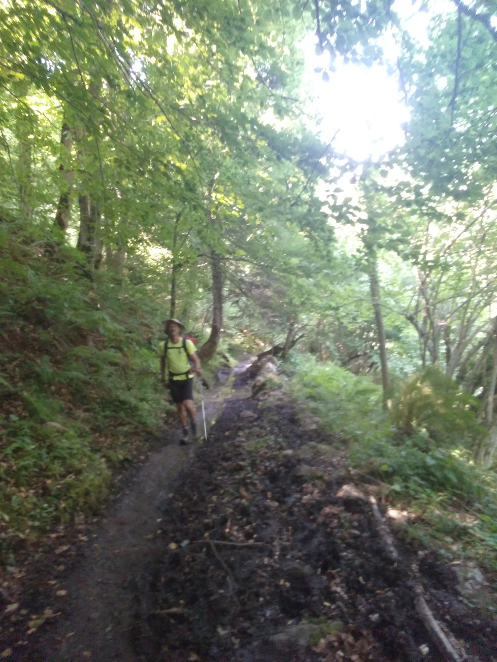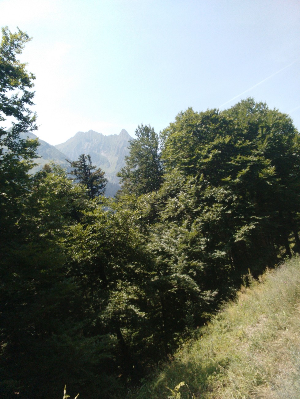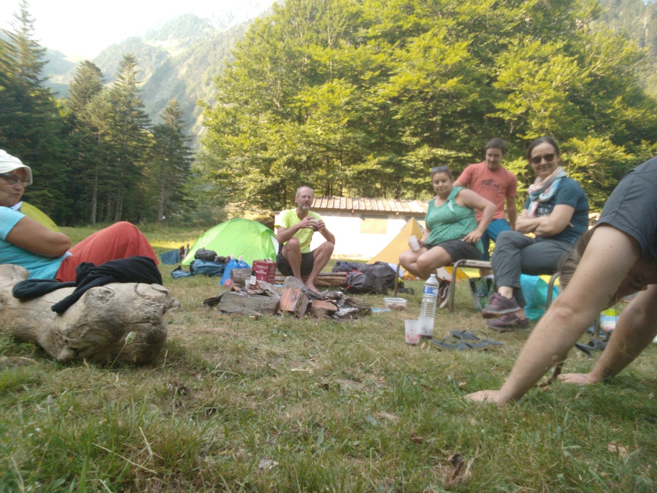 Départ à 7h30 de Benque. On descend doucement puis une petite montée vers le joli village de Saccourvielle. Le sentier fait de petits hauts et bas puis plonge vers Luchon assez abruptement pour déboucher derrière le cimetière. Nous traversons la ville et en profitons pour une petite pause à la boulangerie. Comme on a décidé de ne pas prendre nos provisions aujourd’hui (Sophie, Pascale et Inès vont nous rejoindre en voiture à l’Hospice de France soir pour manger avec nous au bivouac et nous les amèneront), on va s’acheter du pain pour le repas du midi.