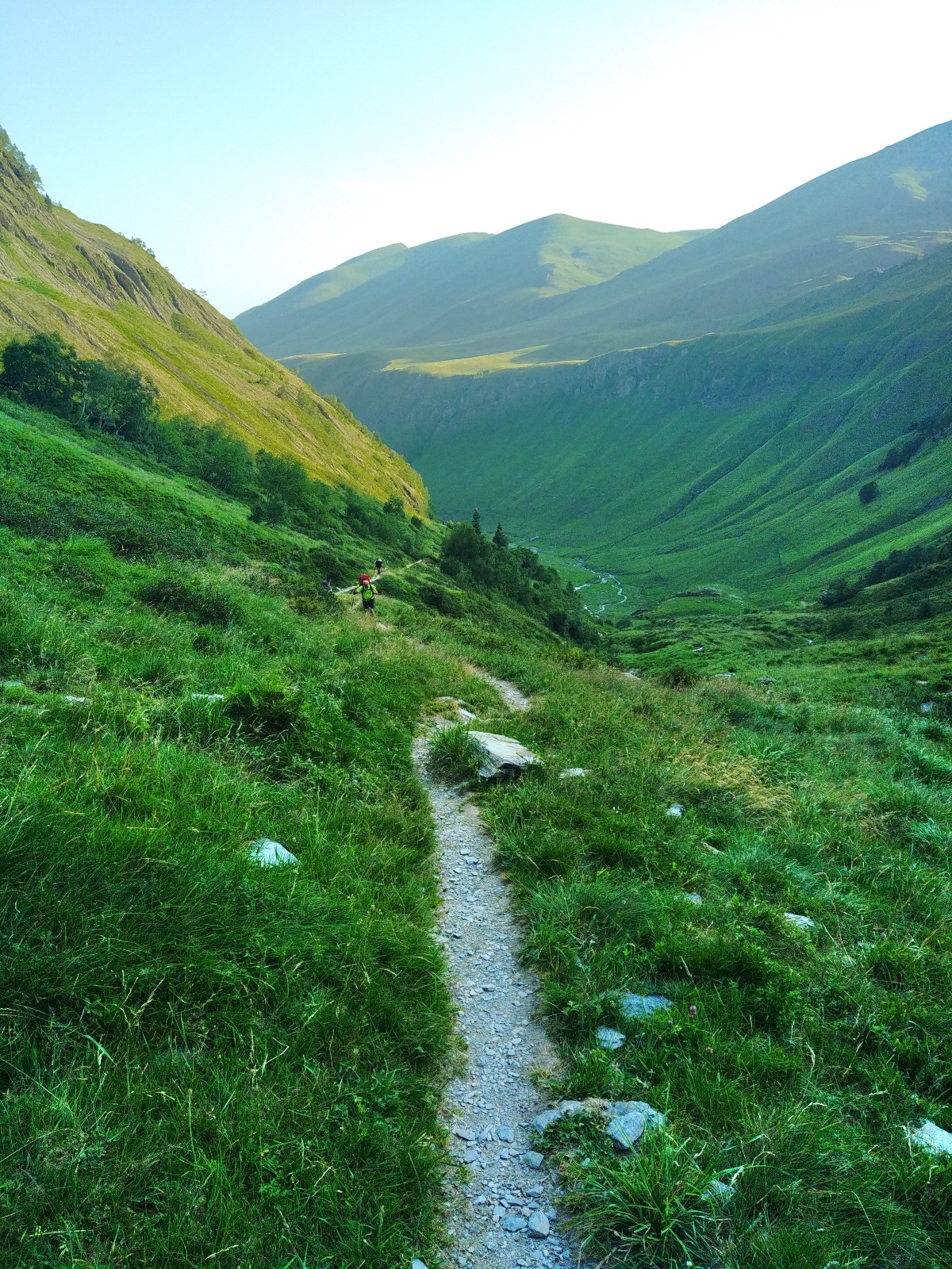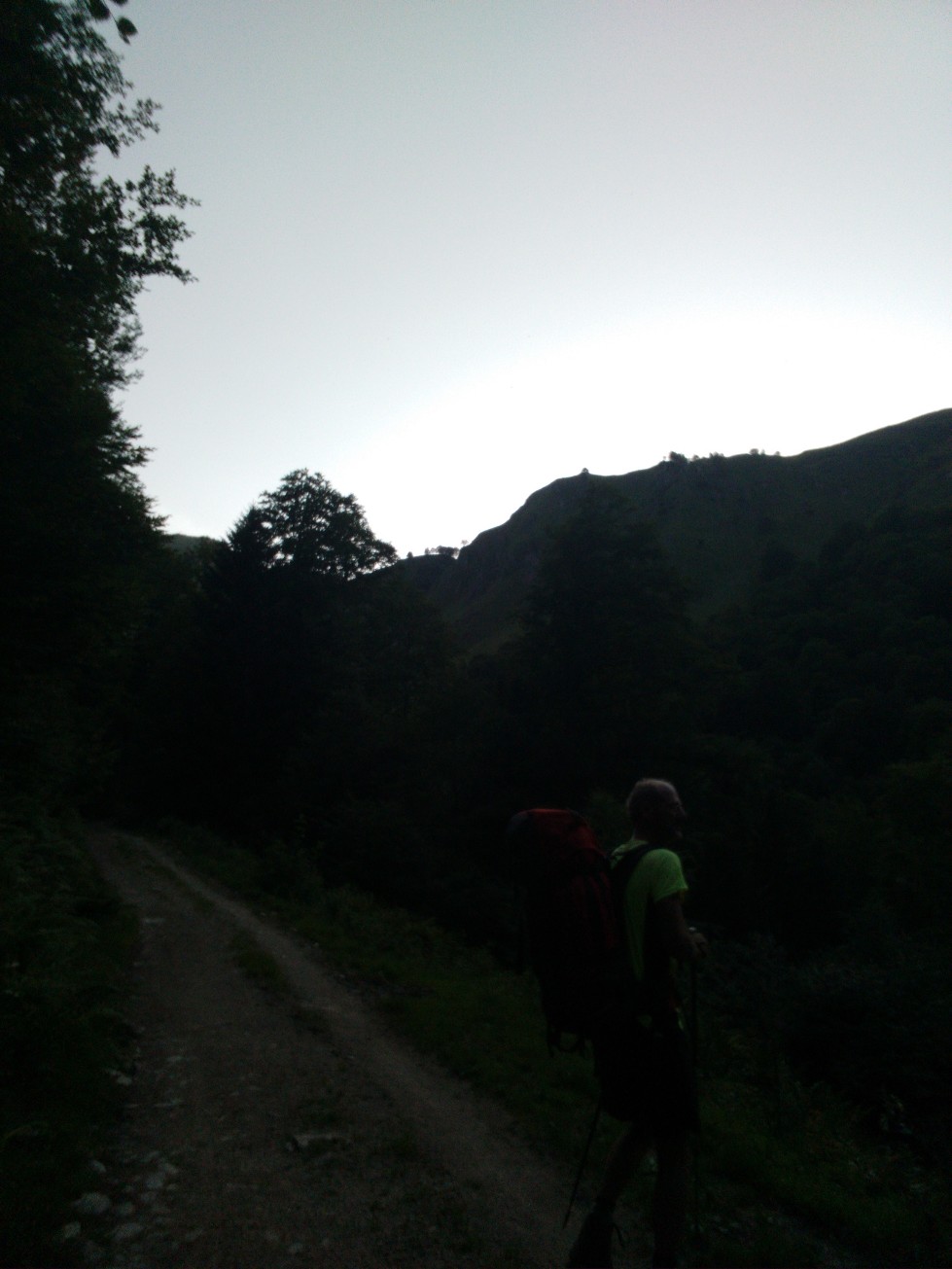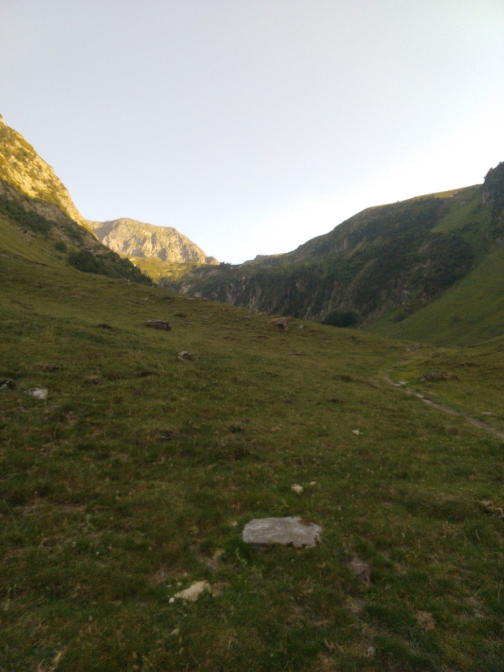On monte de l’Hospice de France vers la frontière espagnole en empruntant la vallée de la Freche. La montée est d’abord assez douce puis on commence à monter dans un sentier pas trop tracé avec des pierriers et de pentes assez raides. Le soleil nous rejoint rapidement et nous continuons jusqu’au col de l’Escalette qui délimite la frontière entre la France que nous quittons pour l’Espagne. Nous ne rejoindrons la France qu’après l’Andorre, à la fin de la randonnée.