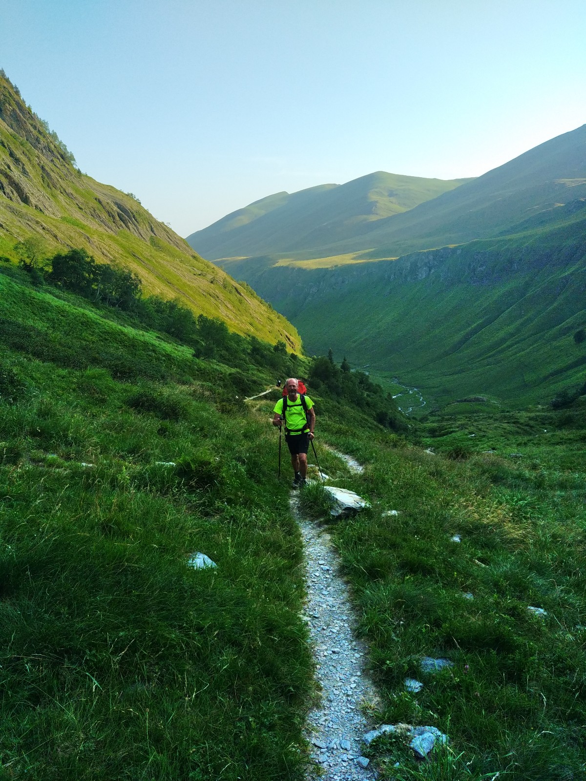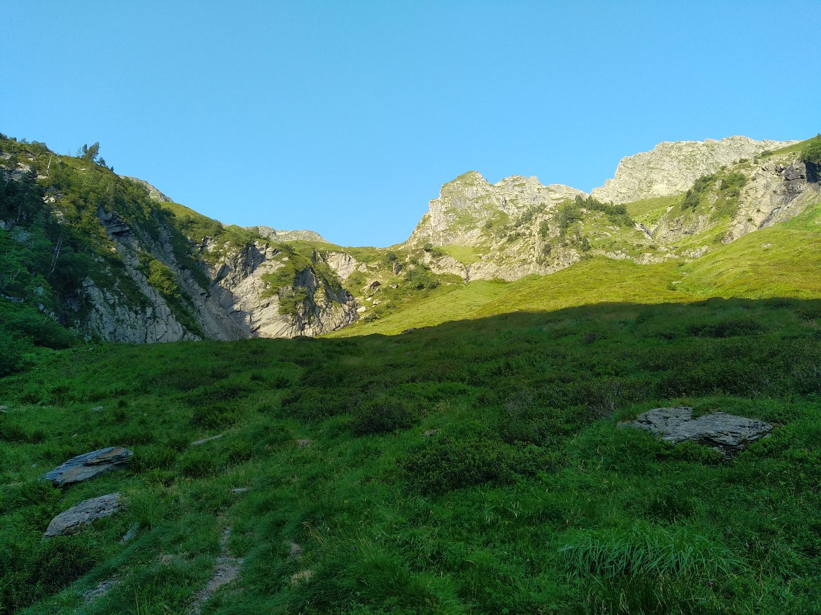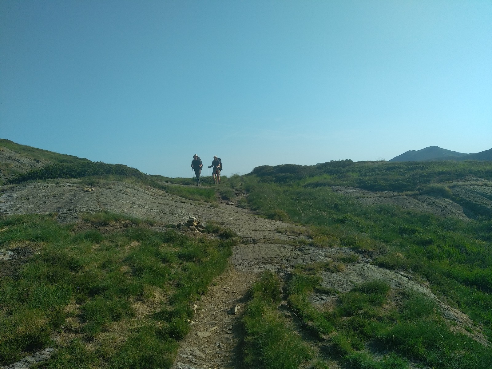On monte de l’Hospice de France vers la frontière espagnole en empruntant la vallée de la Freche. La montée est d’abord assez douce puis on commence à monter dans un sentier pas trop tracé avec des pierriers et de pentes assez raides. Le soleil nous rejoint rapidement et nous continuons jusqu’au col de l’Escalette qui délimite la frontière entre la France que nous quittons pour l’Espagne. Nous ne rejoindrons la France qu’après l’Andorre, à la fin de la randonnée.