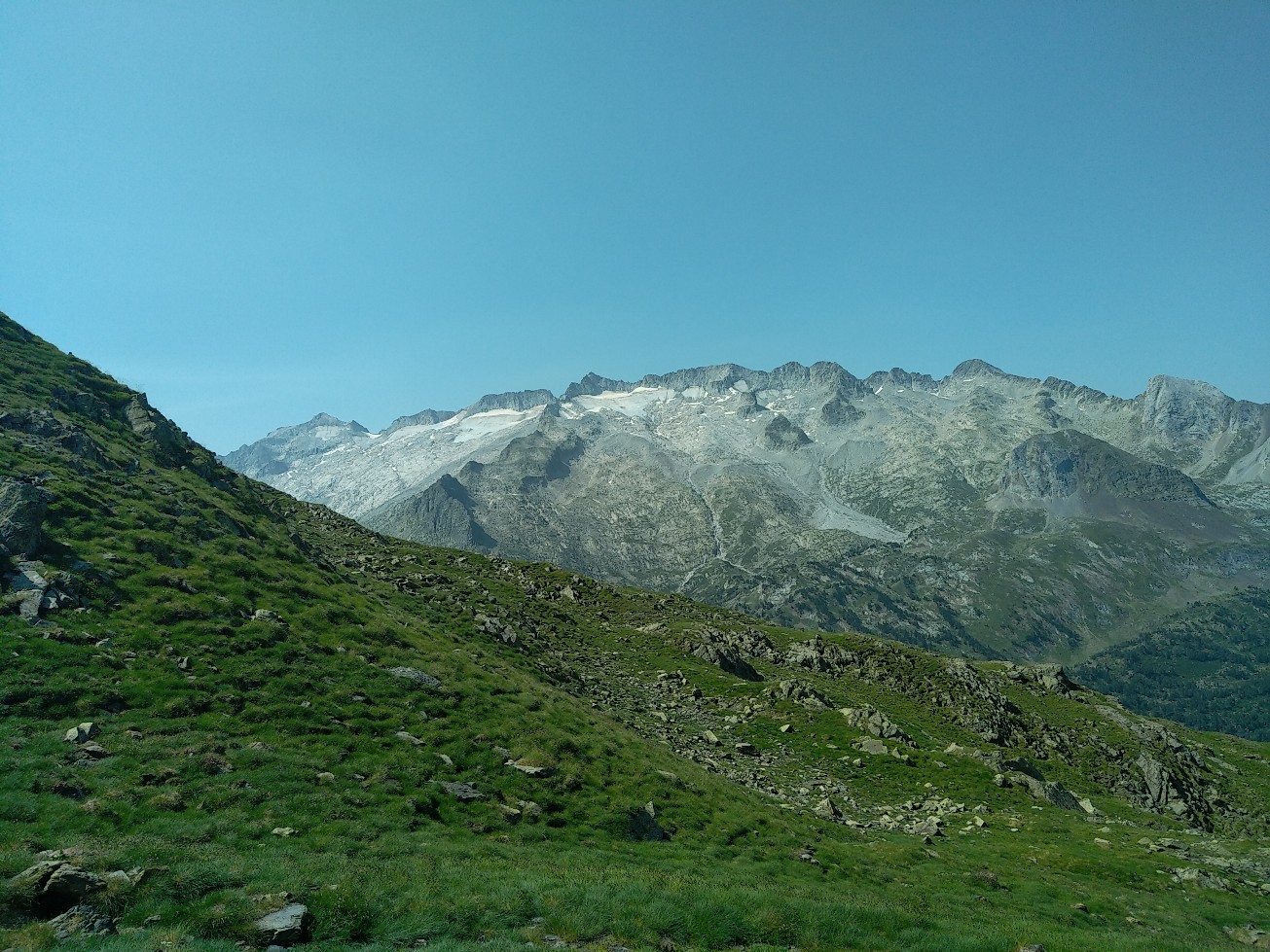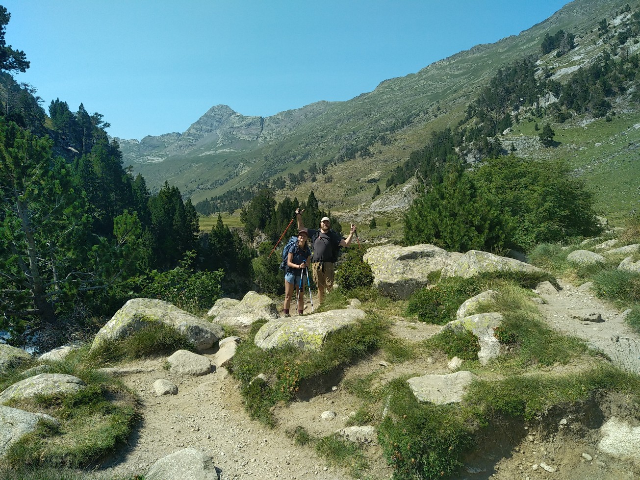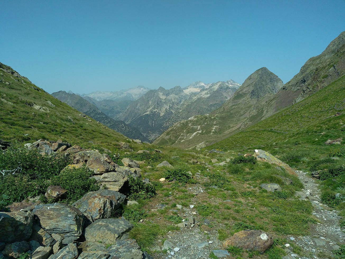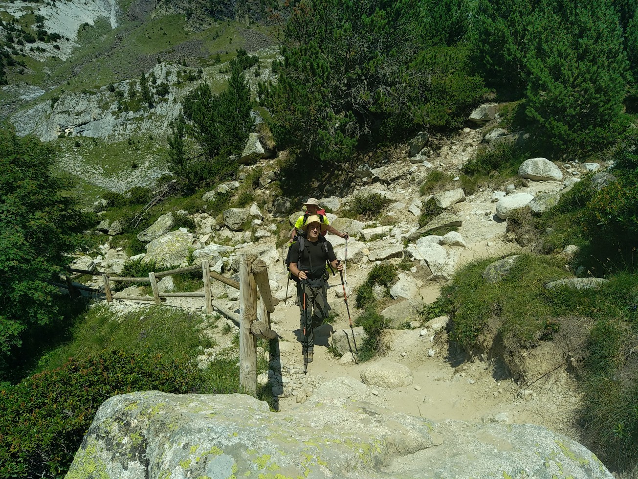 Au col la vue est magnifique et en continuant un peu s’offre à nous tout le massif de la Maladetta et le pic de lAneto avec leurs glaciers. Après notre repas nous terminons une bonne descente qui npis fait arriver en fond de vallée.