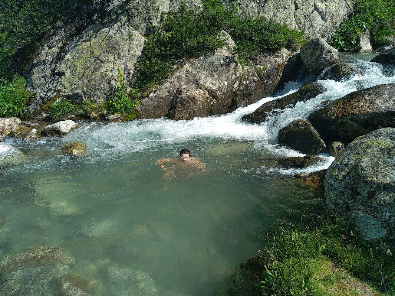 Nous remontons ensuite et en chemin on trouve de nombreuses cascades. Nous bous arrêtons sous l’une d’elle pour une sieste et une baignade. En repartant vers notre point de bivouac on traverse le Plan d’Aiguallut, une très belle cascade qui part ensuite sous la montagne pour alimenter un fleuve. Arrivés au bivouac assez tôt au bord d’un joli torrent. Du coup nouvelle baignade.