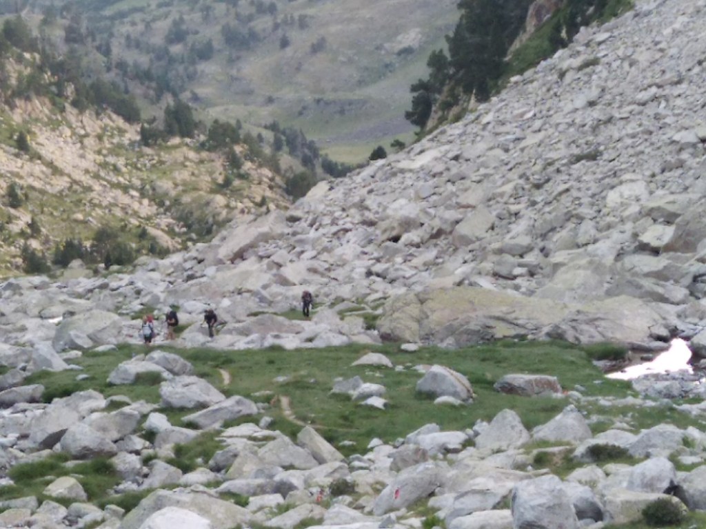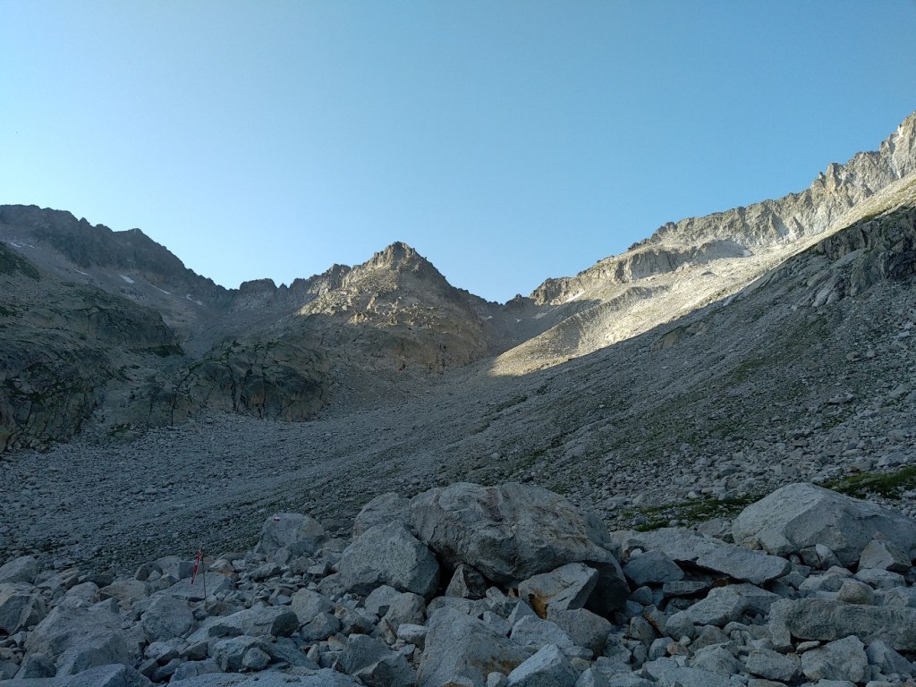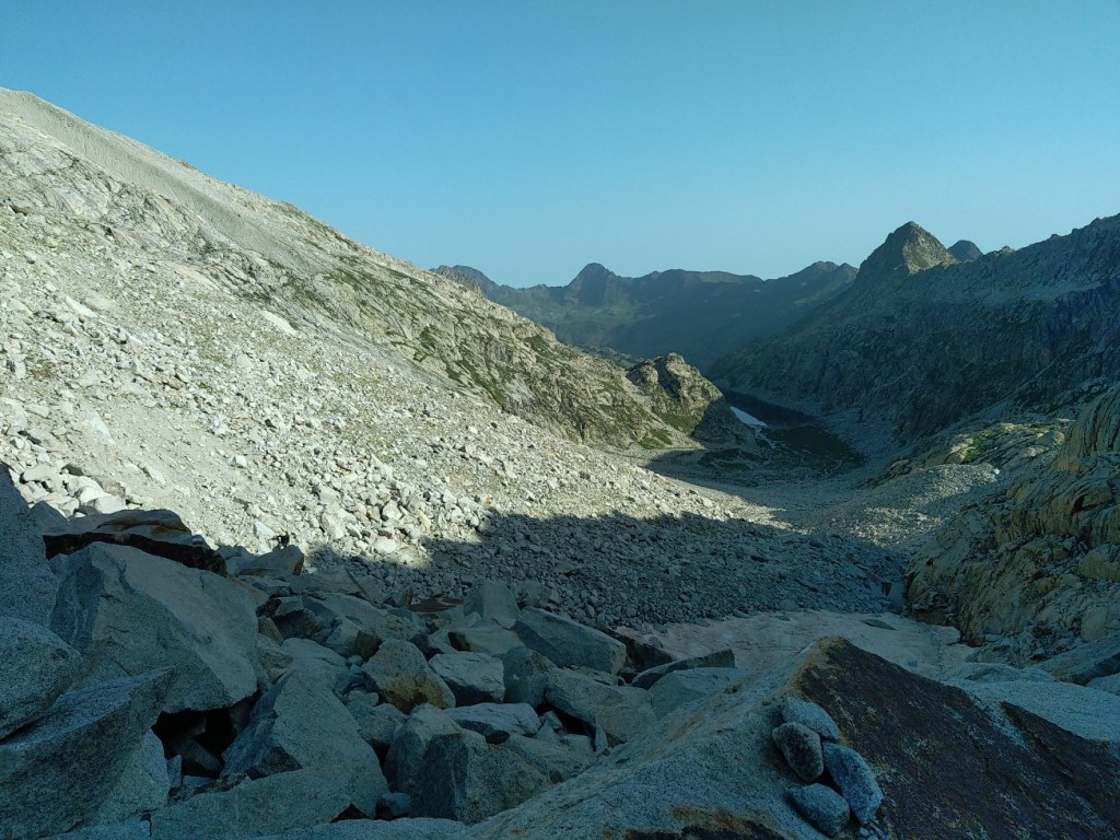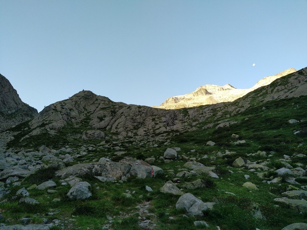 On commence une ascension qui va s’avérer très longue en temps malgré les 5 km à effectuer. Laurent a élaboré la rando sur carte et dénivelé mais le rendu sur le terrain va s’avérer d’une toute autre teneur… Alors c’est parti pour l’ascension du col de Ballenque en empruntant une variante du GR11-5. On part de 2000 mètres pour aller à 2800 mètres. Dès le départ il n’y a pas vraiment de chemin, juste des marques du GR de temps en temps. Bon, on se dit que c’est juste le début de la section, mais c’est finalement toute la journée qui va être comme ça. Ca débute avec une ascension pas trop violente mais principalement faite de blocs rocheux. Le soleil se lève doucement et nous allons rester à l’ombre une bonne partie de la matinée sous le massif de l’ Aneto. A mi-chemin on arrive sur un premier col qui va nous faire basculer dans une vallée glaciaire. Débute alors une longue ascension dans d’énormes blocs rocheux qu’il faut escalader. Le col se dessine tout en haut et il nous faudra 3 heures et demi pour venir à bout des 5 kilomètres. La fin devient assez impressionnante, raide et l’on doit grimper avec les mains pour se hisser jusqu’à ce col étroit.