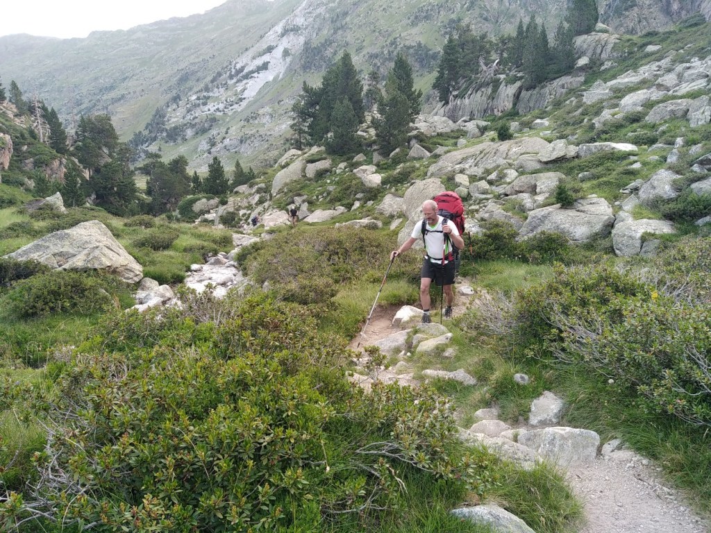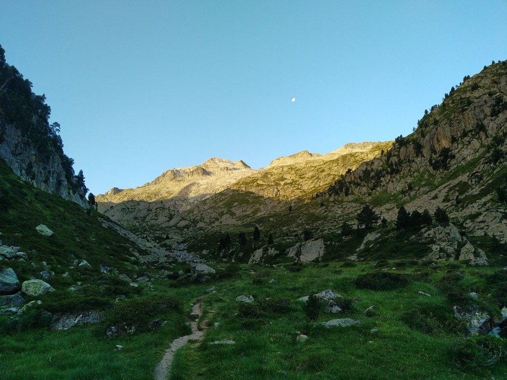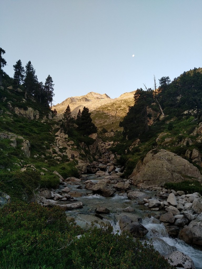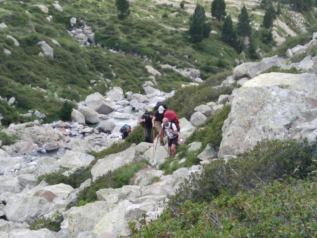 On commence une ascension qui va s’avérer très longue en temps malgré les 5 km à effectuer. Laurent a élaboré la rando sur carte et dénivelé mais le rendu sur le terrain va s’avérer d’une toute autre teneur… Alors c’est parti pour l’ascension du col de Ballenque en empruntant une variante du GR11-5. On part de 2000 mètres pour aller à 2800 mètres. Dès le départ il n’y a pas vraiment de chemin, juste des marques du GR de temps en temps. Bon, on se dit que c’est juste le début de la section, mais c’est finalement toute la journée qui va être comme ça. Ca débute avec une ascension pas trop violente mais principalement faite de blocs rocheux. Le soleil se lève doucement et nous allons rester à l’ombre une bonne partie de la matinée sous le massif de l’ Aneto. A mi-chemin on arrive sur un premier col qui va nous faire basculer dans une vallée glaciaire. Débute alors une longue ascension dans d’énormes blocs rocheux qu’il faut escalader. Le col se dessine tout en haut et il nous faudra 3 heures et demi pour venir à bout des 5 kilomètres. La fin devient assez impressionnante, raide et l’on doit grimper avec les mains pour se hisser jusqu’à ce col étroit.