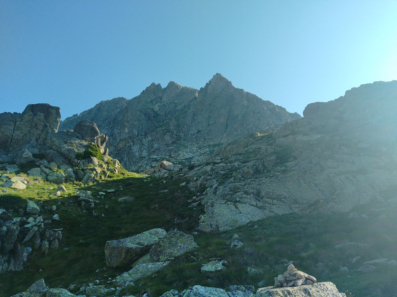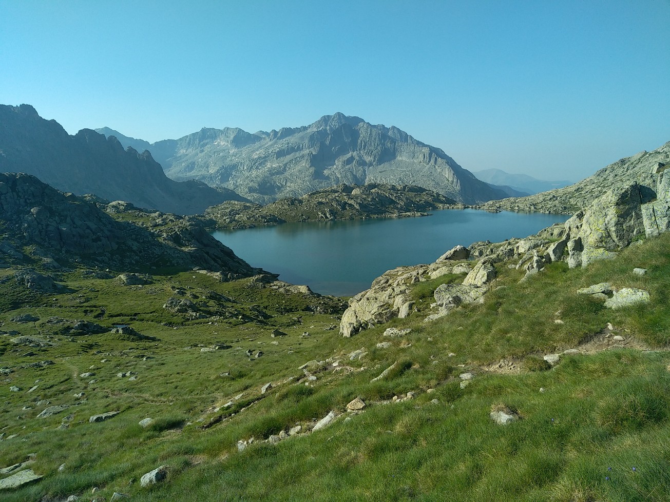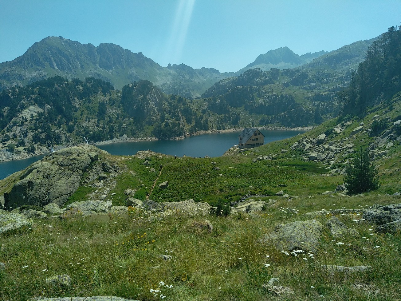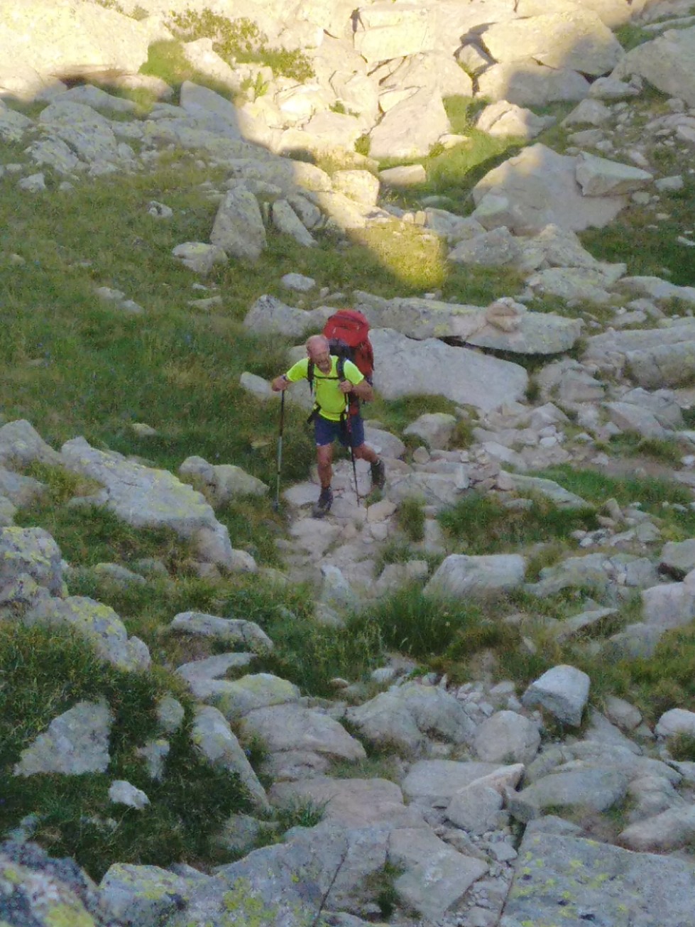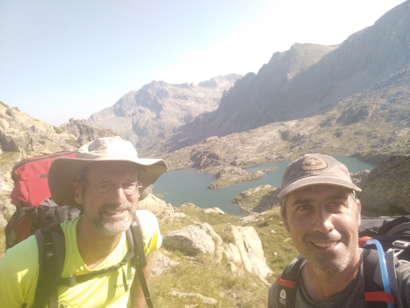 Aujourd’hui petite étape du fait encore de l’interdiction de bivouaquer dans le parc national des Encantats. On a donc 4 heures de marche environ pour rejoindre le refuge de Colomers. On démarre par une belle ascension à l’ombre dans un chemin encore pas mal pierreux mais pas si mauvais que ça. Au bout d’une heure on accède à un premier col qui offre de très belles vues sur les sommets alentours. Un petit replat et on remonte sur un deuxième petit col, après quoi on redescend sur un joli lac où nous faisons une petite pause. Une nouvelle petite ascension nous mène au col de Caldes puis nous descendons un vallon qui va nous mener au refuge. Juste avant on décide de manger au bord d’un ruisseau et pas de chance je me tords la cheville dans un trou que l’on ne voyait pas à cause de hautes herbes. Je passe mon repas le pied dans l’eau froide du ruisseau en espérant que ca va aller, d’autant plus qu’on a 3 grosses étapes devant nous….