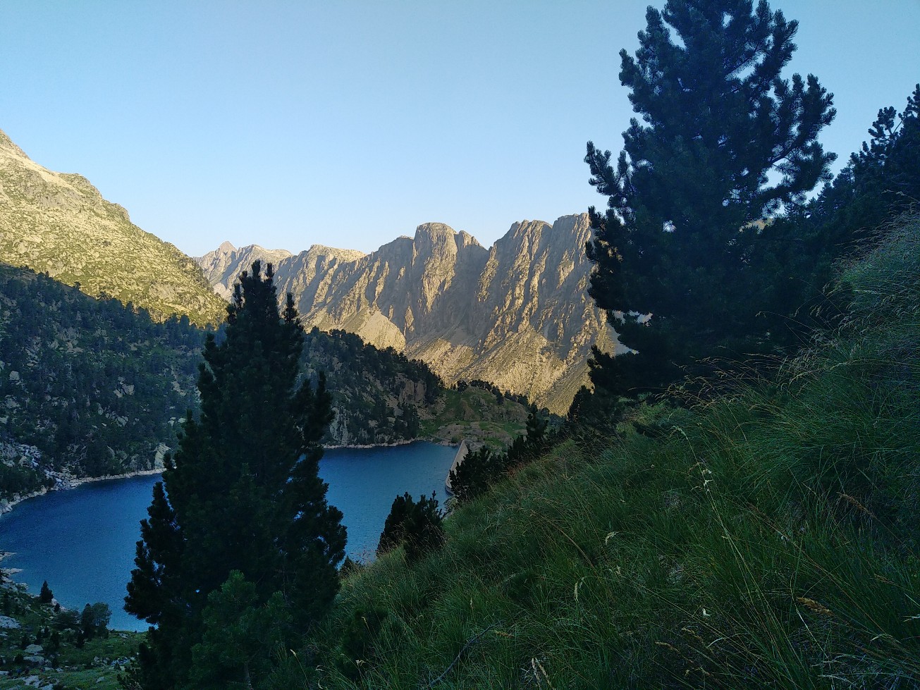 Aujourd’hui petite étape du fait encore de l’interdiction de bivouaquer dans le parc national des Encantats. On a donc 4 heures de marche environ pour rejoindre le refuge de Colomers. On démarre par une belle ascension à l’ombre dans un chemin encore pas mal pierreux mais pas si mauvais que ça. Au bout d’une heure on accède à un premier col qui offre de très belles vues sur les sommets alentours. Un petit replat et on remonte sur un deuxième petit col, après quoi on redescend sur un joli lac où nous faisons une petite pause. Une nouvelle petite ascension nous mène au col de Caldes puis nous descendons un vallon qui va nous mener au refuge. Juste avant on décide de manger au bord d’un ruisseau et pas de chance je me tords la cheville dans un trou que l’on ne voyait pas à cause de hautes herbes. Je passe mon repas le pied dans l’eau froide du ruisseau en espérant que ca va aller, d’autant plus qu’on a 3 grosses étapes devant nous….