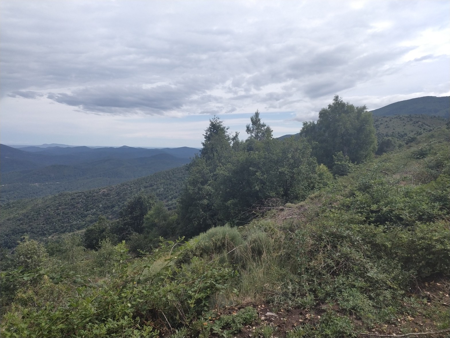 Je commence par prendre un itinéraire alternatif pour rejoindre l’hexatrec vu que la camping était loin du chemin. C’est un petit sentier de montagne très joli qui monte à travers une châtaigneraie. Par contre il est sacrément raide et ne s’embête pas avec des lacets : il monte droit dans la pente. La fatigue accumulée ces 3 derniers jours avec la chaleur me rend cette ascension difficile. Je monte doucement pour économiser mes forces vu la journée qui m’attend. Arrivé au col de la croix de Bancilllon je rejoint le chemin. Il va pleuvoir toute la matinée et une partie de l’après midi mais au moins il fait frais (on a perdu 20 degrés). Encore une petite ascension pour arriver à une antenne relais avec une belle vue. Le chemin monte ensuite pour suivre une ligne de crête avec une belle vue à 360 degrés. C’est très glissant avec la pluie et le chemin n’est pas toujours bien tracé mais c’est beau.