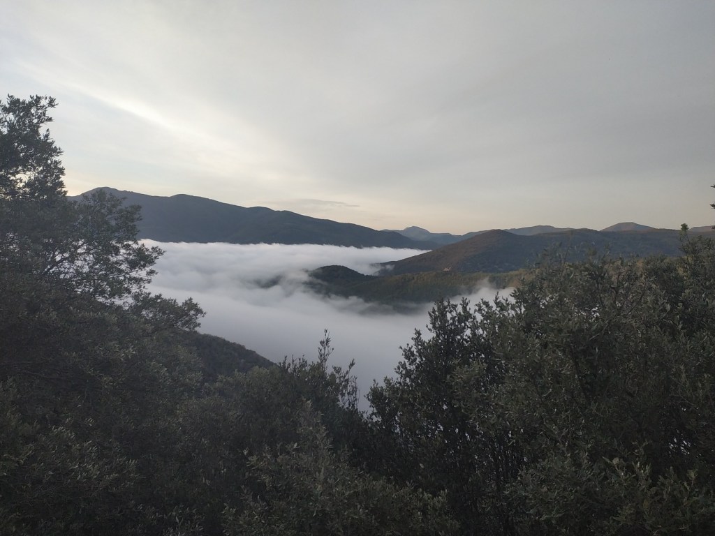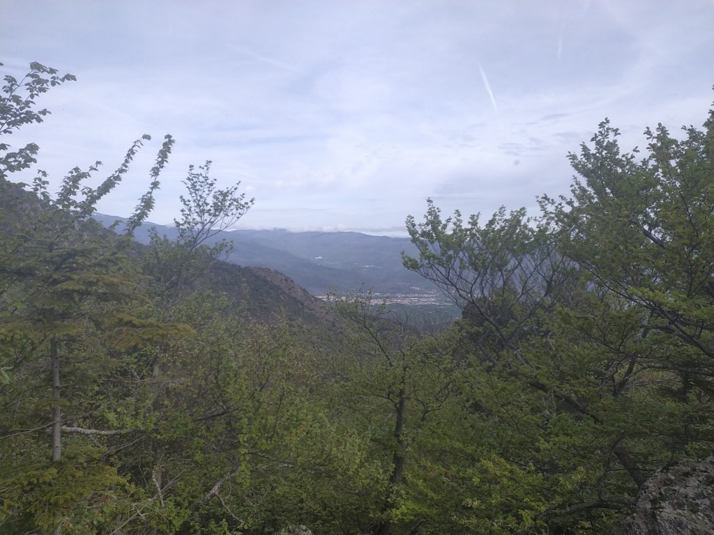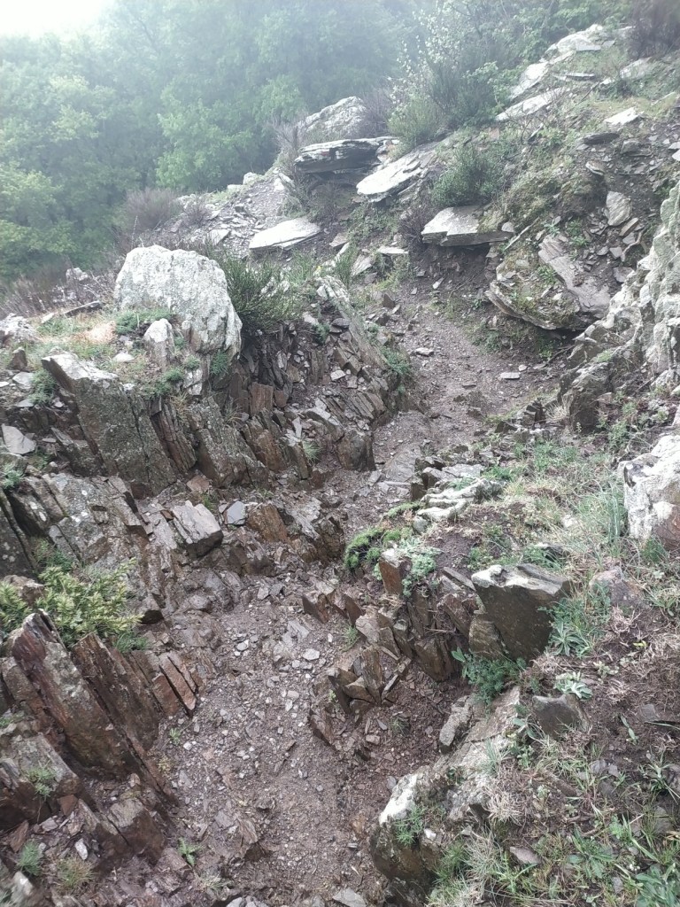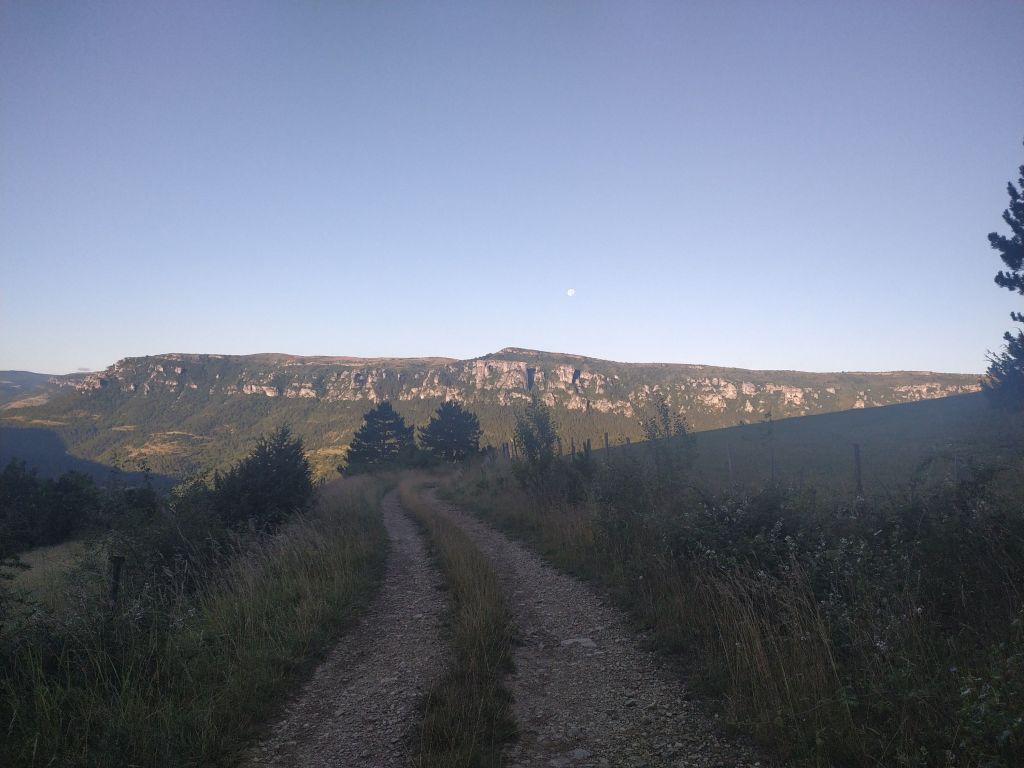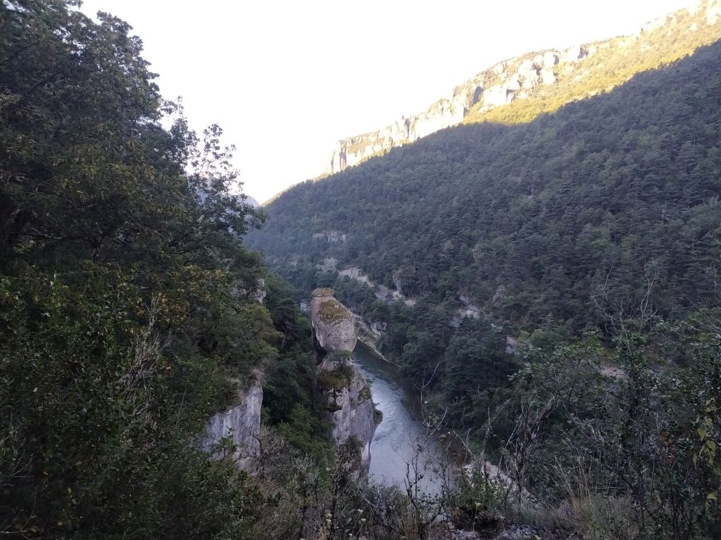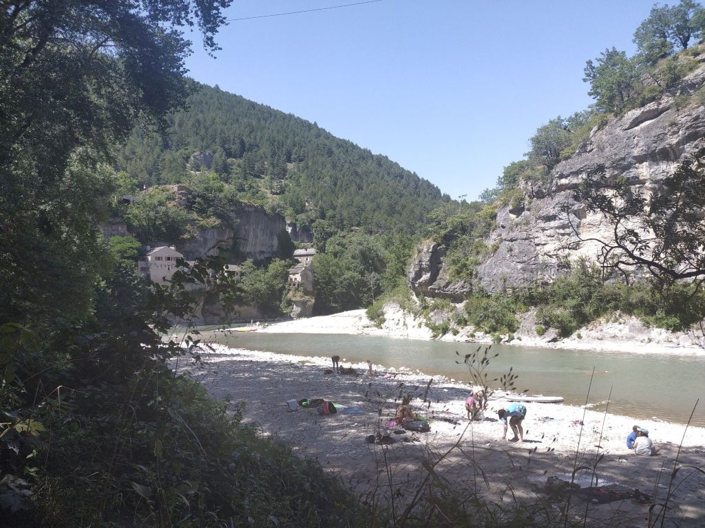 J’ai juste 11 km à faire pour rejoindre le village de Le Rozier où Sophie va me rejoindre. Lever tardif, réveillé par une nouvelle pérégrination bovine tintinabulante. Je poursuis la descente des gorges du Tarn par un joli sentier alternant les hauts et les bas, en passant par un hameau néobab où dorment de jeunes gens dans des grottes ouvertes aménagées ou dans des anciennes maisons en pierre qu’ils retapent.